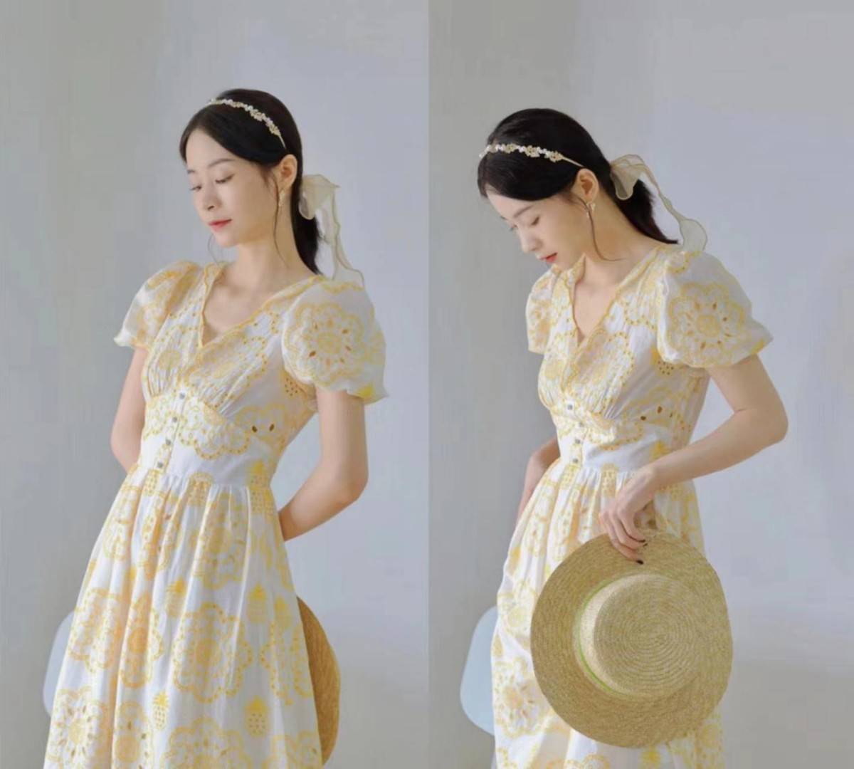 这款泡泡袖连衣裙,是比较有特色的存在,白色和黄色的拼接,既有白色的清爽简约,又有黄色的跳脱活力。