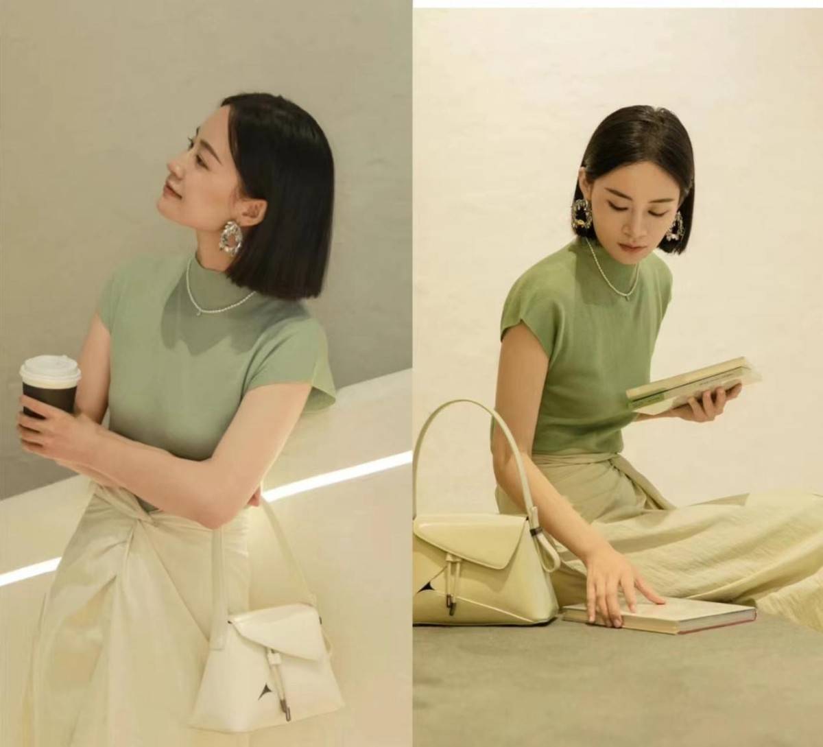 在上半身可以运用修身一点的绿色单品,勾勒出饱满婀娜的曲线,配色清新,但服装的设计凸显出了轻熟感。