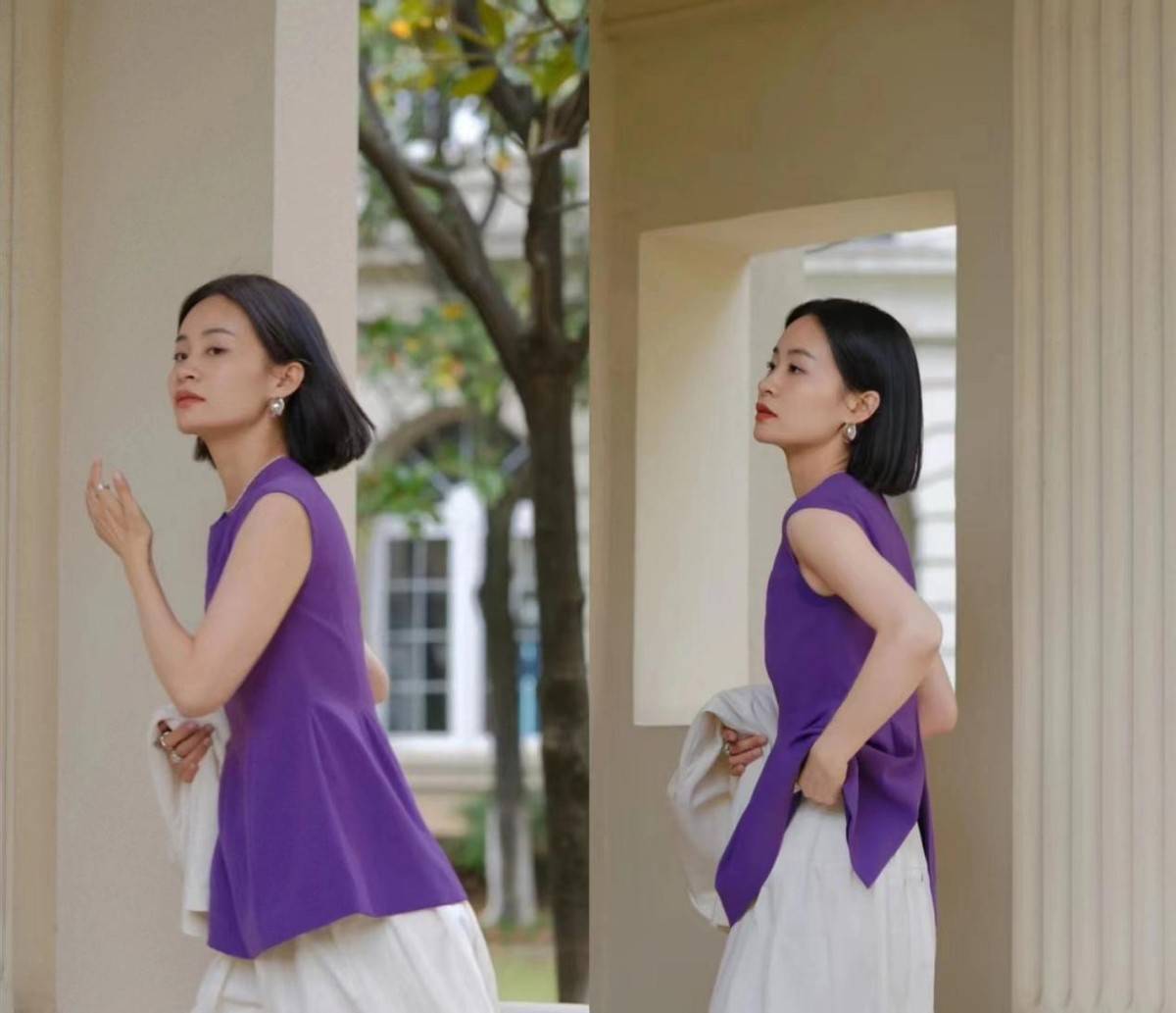 像这款紫色的无袖上衣,组合白裙,是相当利落率性的打扮。而裙子自带的清爽优雅的感觉,并不会被抹去。