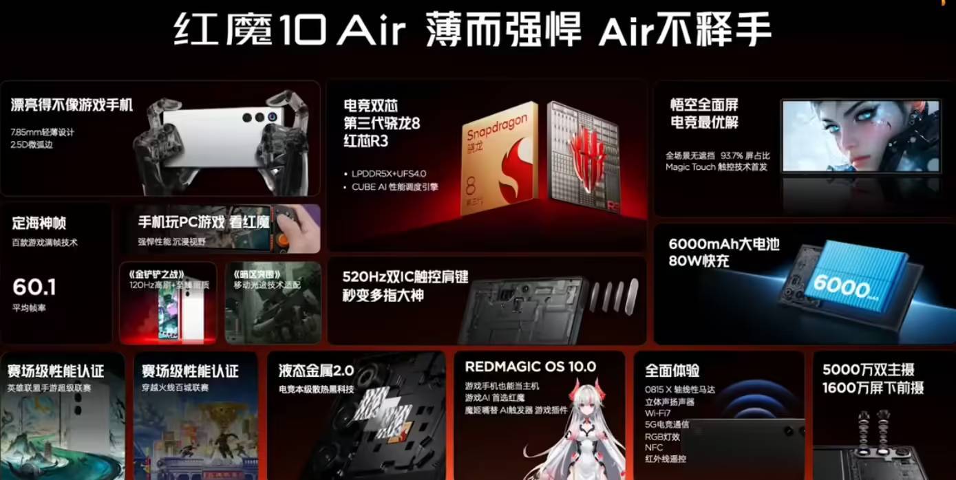 作为参考,今年 4 月发布的红魔 10 Air 起售价为 3499 元,该机机身厚度为 7.85mm,号称“红魔史上最薄全面屏手机”。其搭载骁龙 8 Gen3 处理器及红芯 R3 电竞芯片,采用6.8英寸“悟空全面屏”,内置 6000mAh 电池并支持 80W 有线快充,后置 5000 万像素双摄。