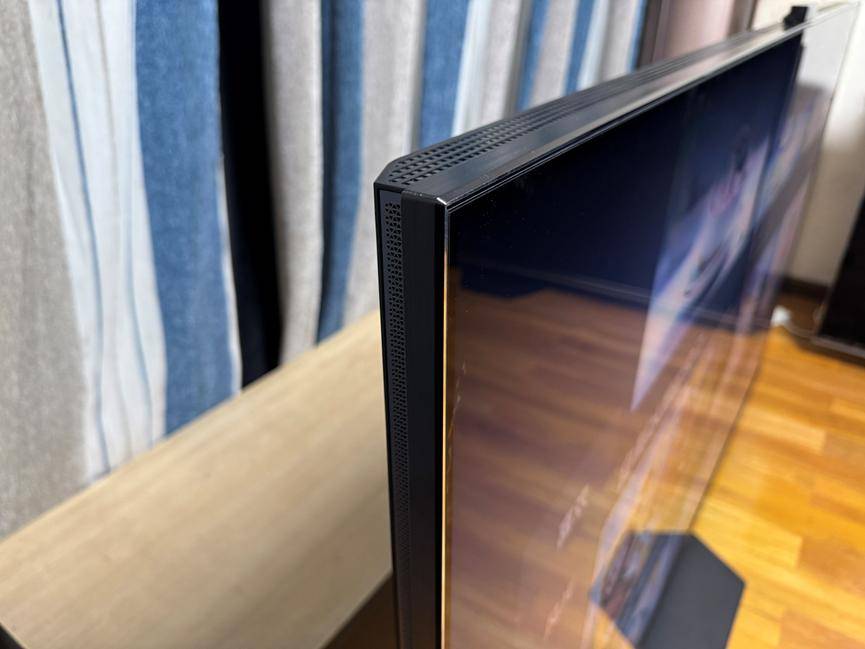 U7S Pro在下方采用了前出音的设计,下方和左右两侧都采用一种新的钻切工艺,营造出一种非常立体的棱线,搭配璀璨星钻的出音设计,这的确和市面上的其他电视观感都截然不同。和我们之前测试的100UX比起来,U7S Pro看起来会更简单一些,但那种轻奢的感觉并没有变。另外,在机身下方的左右,分别有RGB-Mini LED以及帝瓦雷的金属标识,看起来档次感也有提升。