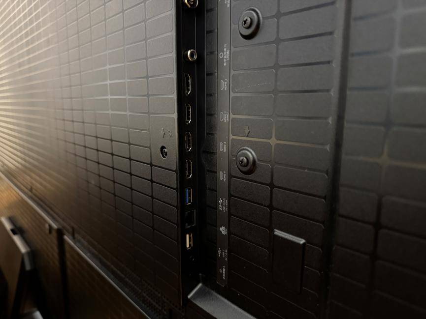U7S Pro整机最薄处只有46mm,背部也采用了纯平设计,拥有独立的低音单元,贴墙会有很好的效果,当然我们测试的时候还是用的金属中置底座,这也是我们比较喜欢底座设计。在接口部分,U7S Pro采用了四个HDMI 2.1、一个USB 3.0、一个USB 2.0、百兆网口、有线电视接口、同轴输出、AV复合接口的组合,外侧还有一个USB 2.0的接口,足以满足不同用户的需求。