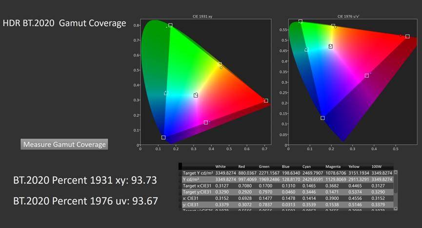 在色域部分,借助于RGB-Mini LED背光,U7S Pro在BT2020覆盖率上接近94%,这是一个惊人的数值。这不仅表示U7S Pro有着比大多数电视更出色的纯色表现,同时在复杂场景下,它的色彩表现也应该更优秀。