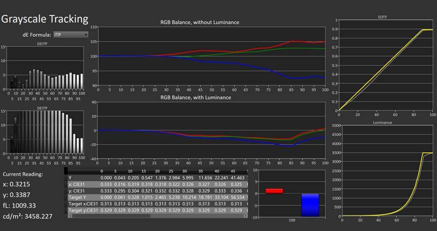 在SDR下,U7S Pro初始色准△E平均低于2.5,色温在D6636K,这是不错的开箱即用表现。另外在亮度部分,我们很轻易就在Filmmaker模式下,在10%的窗口下就跑到了接近5000nits的峰值亮度,超越了官方的宣传数据,全屏也超过了850nits的亮度,说U7S Pro是目前最亮的RGB-Mini LED电视之一,并不算太夸张。