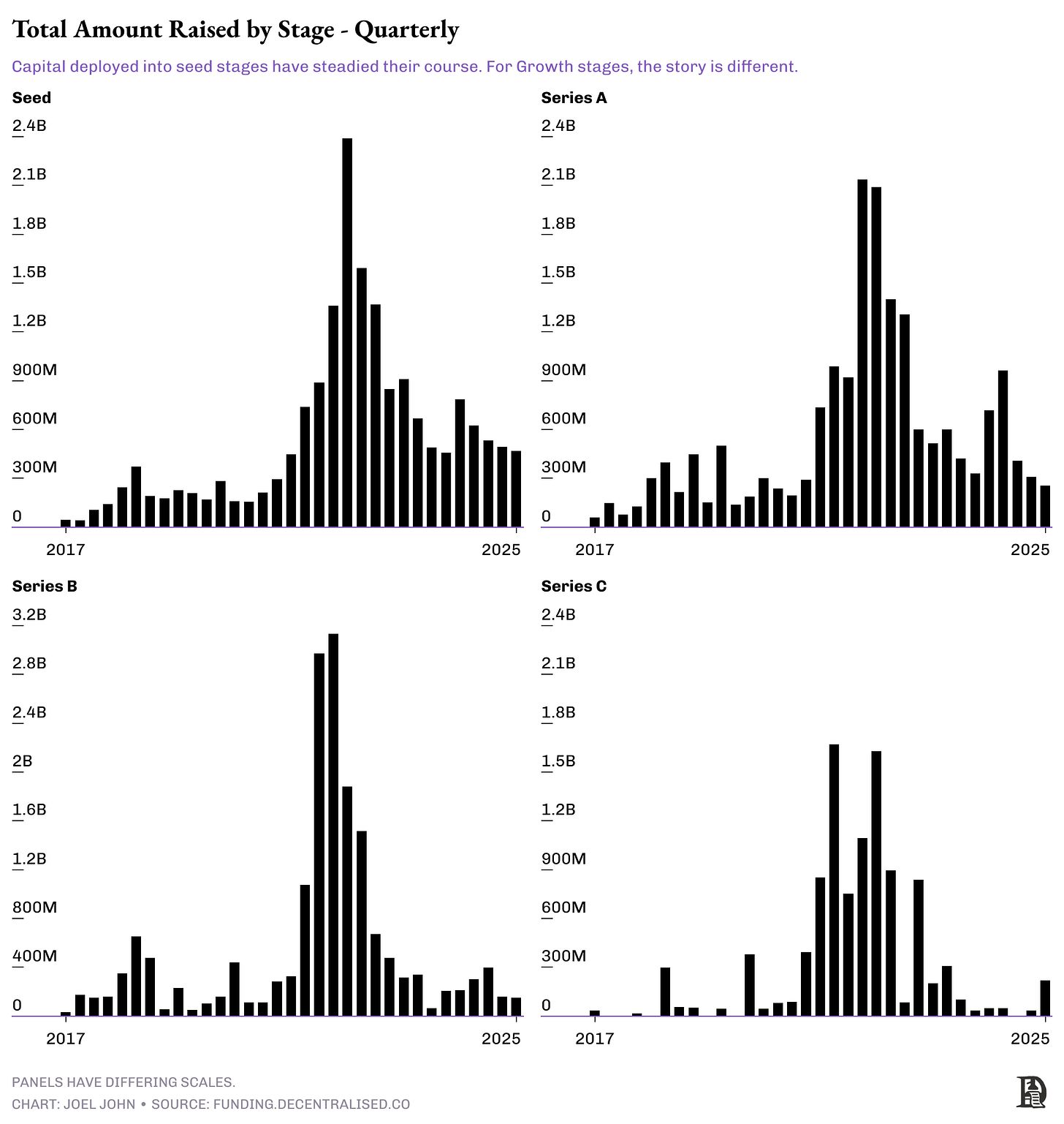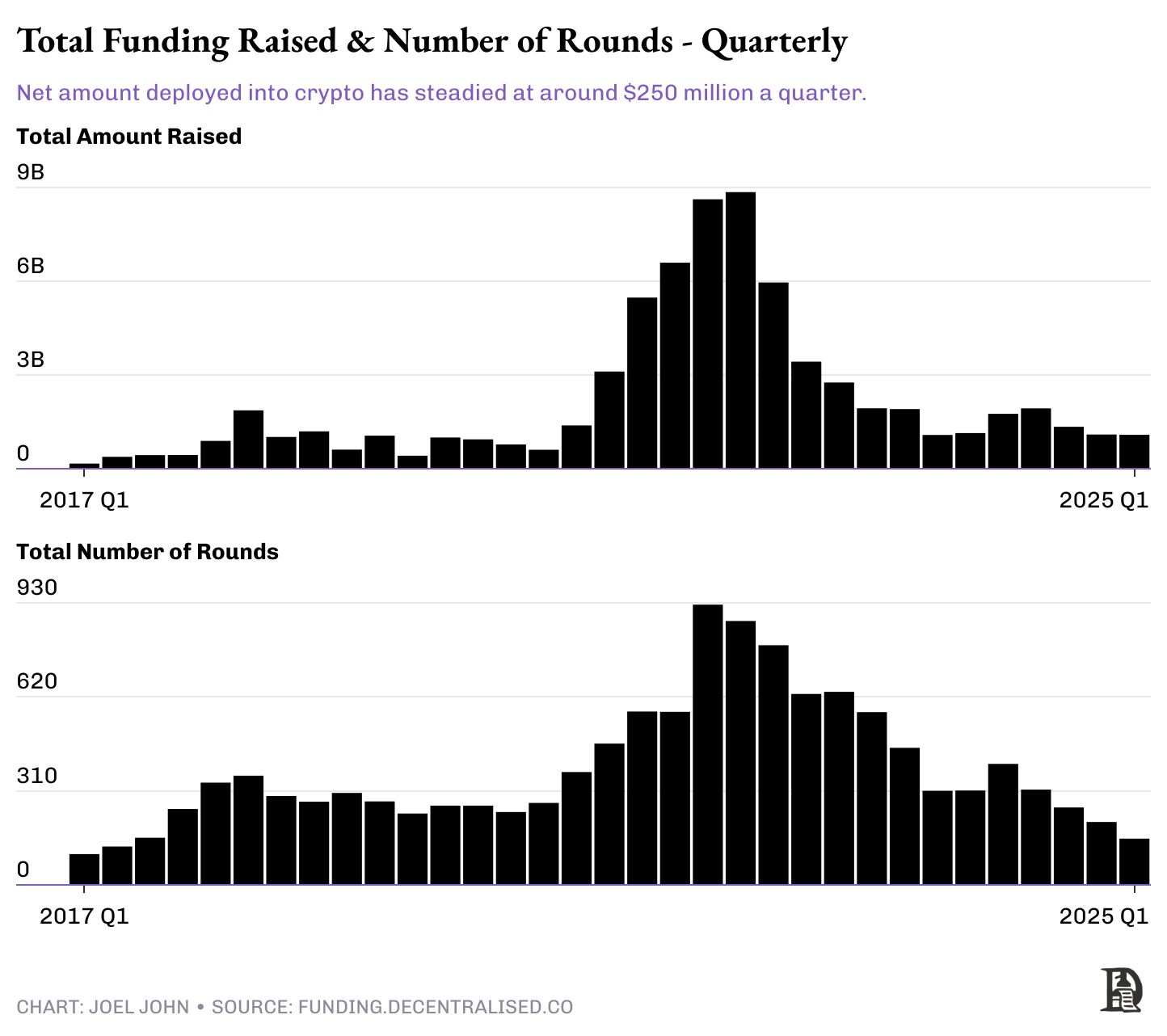 我已经连续六年在写类似的数据与趋势分析。每次写到最后,我都会得出相同的结论:风险融资只会越来越难。我24岁时或许并未意识到,这其实是一个行业自然演化的过程。狂热期会吸引人才与轻松的资本,但市场效率法则决定了一切会逐渐变得艰难。在2018年,只要“在区块链上”就已经足够了,而到了2025年,我们开始真正关注盈利能力与产品市场契合度。