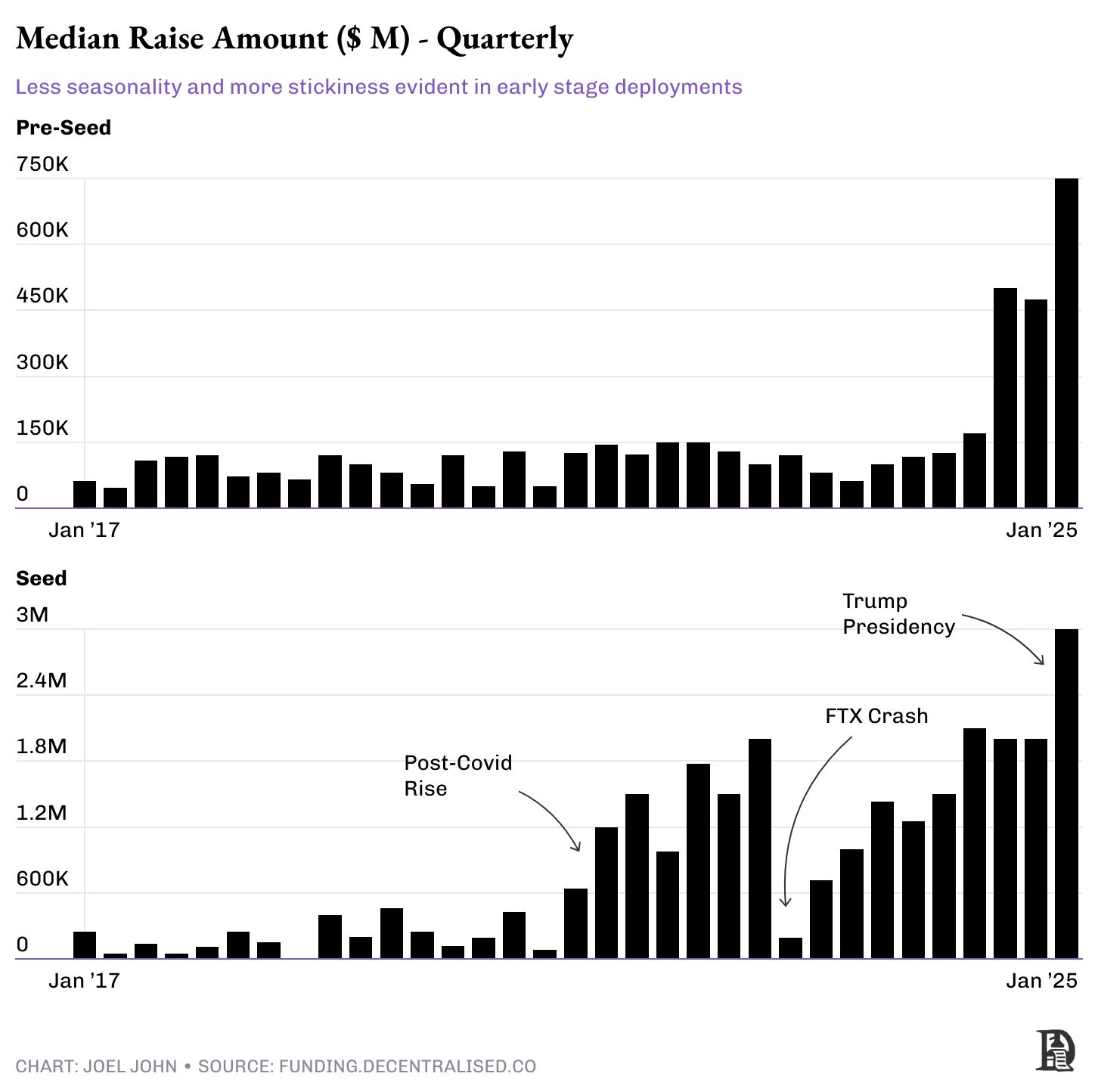 我们看到公司在pre-seed和seed阶段融到的钱越来越多,尽管早期资本的风险偏好正在下降。原本属于“亲朋好友”轮的融资,现在越来越多地由早期基金提前参与完成。这种趋势也影响到了seed阶段的公司。自2022年起,seed融资轮的规模持续扩大,以应对加密货币行业不断上升的用人成本和实现产品市场契合(PMF)所需的更长周期。但产品开发成本的下降在一定程度上抵消了这种影响。