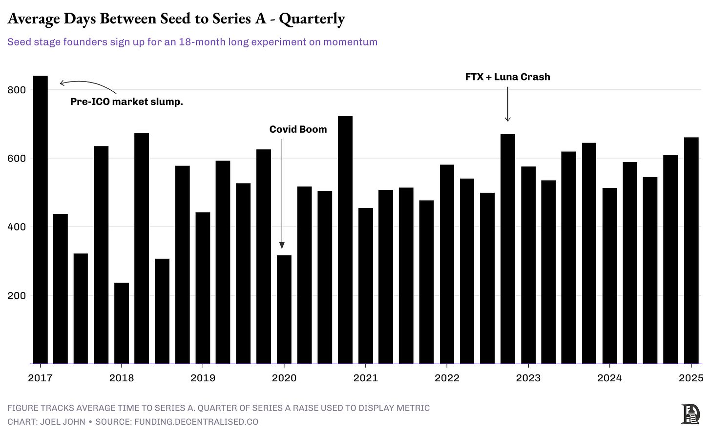 验证这一观点的方式之一,是通过“资本动量”的视角来观察。在下图表中,我统计了每家完成A轮融资的初创企业,自宣布获得种子轮以来所经历的平均时间。数字越小,说明资本流动速度越快,也就是说,投资者在公司尚未成熟之前,就以更高的估值投入了更多资金。