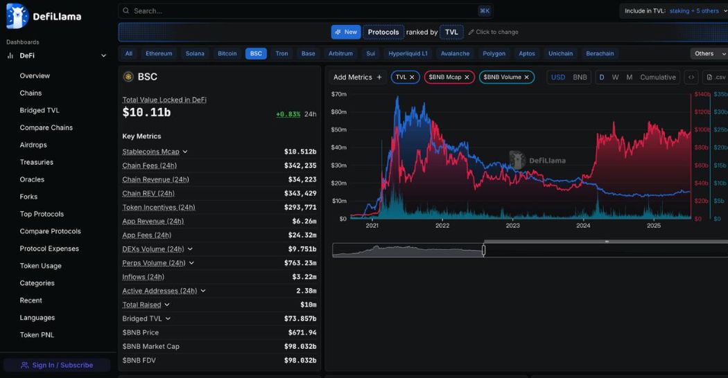 从 DeFi 总锁仓(TVL)看,BNB Chain 达约 100 亿美元的协议级资产规模,位列第三,远超 Polygon(10.72 亿美元)和 Avalanche C(15.25 亿美元)。如果再加上跨链桥接 TVL(Bridged TVL)154.48 亿美元的量级,就能更直观地感受到 BNB Chain 作为 "流量转接枢纽" 的地位:大量资产通过桥接流入,再在本链的借贷、交易和衍生品市场中获得二次活化。