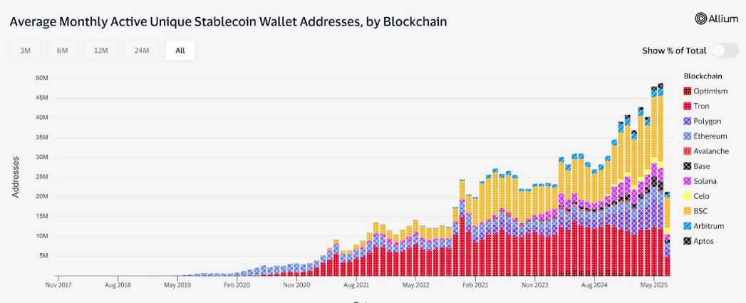 BNB Chain 在稳定币交易领域同样表现出了强劲的增长势头。根据 Allium 数据显示各公链在 "月均活跃稳定币wallet地址" 中的相对份额演变,2025 年 7 月的数据 BNB Chain(黄色)已经成为wallet地址最多的公链占比 36.7%,其次是 Tron(红色,21.7%)、Polygon(紫色,10.7%)、Celo(黄斑点,7.3%)和 Solana(粉紫,6.7%),而曾经霸主的以太坊(蓝叉号)此时仅占 5.4%。