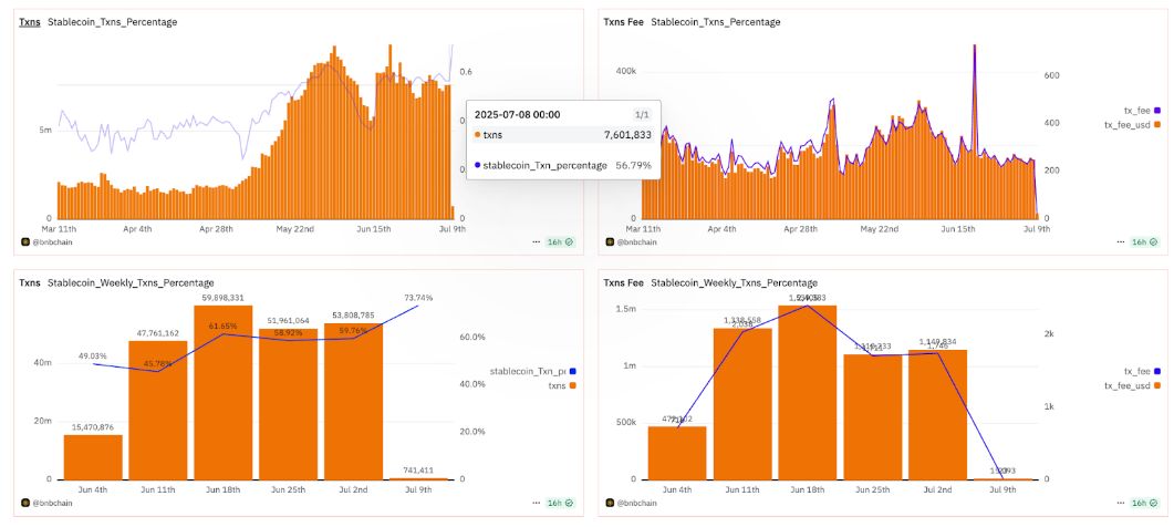 与此同时,来自 BNB Chain 官方 Dune 数据的 "稳币交易占比" 图也佐证了它的高频使用特征:BSC 近几个月稳定币交易数位列全网第一,生态内来看,最近一周,BSC 上的稳定币交易数量占比已攀升至 60%-74% 的区间。