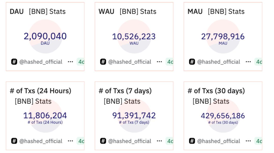 在用户活跃与链上交互层面,BNB Chain 同样交出了一份亮眼答卷:日活跃地址(DAU)达到 2,090,040,意味着每天有超过 200 万唯一地址发起交易或调用合约,保持了高频的链上参与度;周活跃地址(WAU)则有 10,526,223,相当于一周内有逾 1,000 万不同地址至少一次回访,用户粘性和复访率均处于行业顶尖水平;月活跃地址(MAU)更是飙升至 27,798,916,接近 2,780 万,表明近三分之一的活跃加密用户每月都会在 BNB Chain 上进行操作。