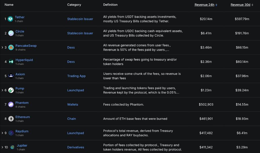 在交易量的绝对领先之外,PancakeSwap 在收入端的表现同样令人瞩目。根据最新的 Protocol Revenue 排行榜,其 24 小时手续费收入达 346 万美元,30 天累计则高达 6.6 亿美元,仅次于 稳定币玩家 Tether(24 小时收入达 约 2,014 万美元)和 Circle(641 万美元)这一成绩不仅反映了用户对低至 0.01% 费率的高度认可,也体现了 PancakeSwap 将交易量转化为持续现金流的强大能力。相比之下,Hyperliquid、Axiom、Pump 等新兴协议虽然也在积极抢占市场,但无论是多链覆盖(Pancake 已支持 9 条主流链)还是收益规模,仍与 Pancake 保持明显差距。
