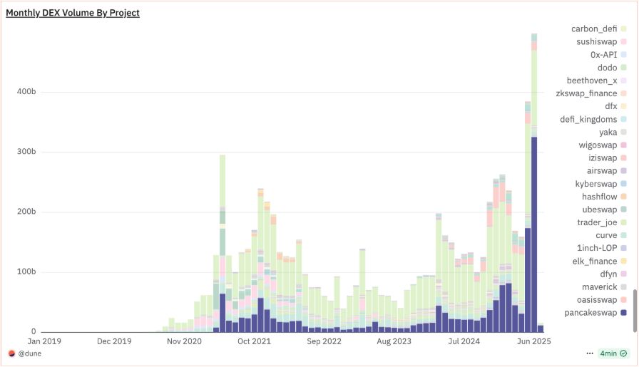 2025 年上半年,PancakeSwap 再次完成了自我跃迁——从 BNB Chain 上的 "默认 DEX",变成横跨多链的交易中枢,也成为 Alpha 项目上线首选平台。在 Alpha 流量、Meme 项目热潮以及多链布局的共同推动下,Pancake 的交易量、市占率、用户数和协议收入全面爆发,成为 BNB Chain 最核心的增长引擎。
