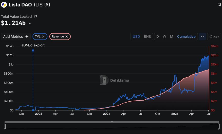 根据 DefiLlama 数据,Lista Lending 当前锁仓资产已超 12 亿 美元,累计借贷量逾 6.3 亿 美元;协议日均收入稳定在数十万美元,过去 30 天总收入近 38 万美元,足见其将借贷利息高效转化为持续现金流的能力。