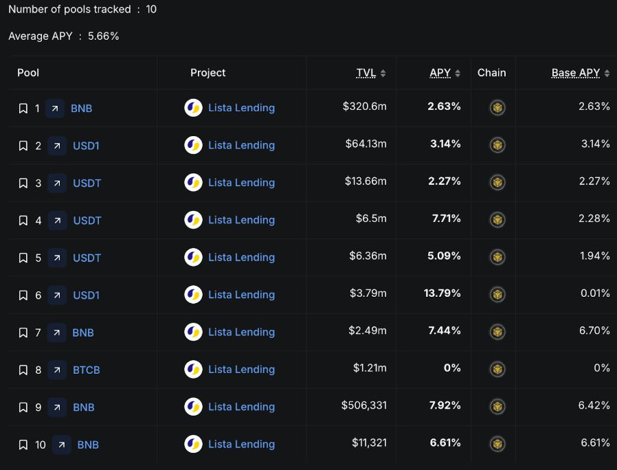 当前 Lista 已集成 10 个核心借贷池,平均年化收益率约 5.66%,涵盖 BNB、USDT、USDC 等主流资产,同时推出了 slisBNB 的自动清算和 lisUSD 的去中心化稳定币功能,既满足稳健收益需求,也为杠杆交易提供了充足弹药。