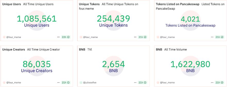 从上图中不难看出,Four.meme 的 独立用户数已突破 108 万,生成 超 25 万枚独特代币,其中 4,021 枚成功对接 PancakeSwap,形成初级流动性。TVL 达到 2,654 BNB,累计交易量更是高达 1,622,980 BNB;与此同时,共有 86,035 位创作者在这里留下足迹——如此庞大的创作和交易基数,足以证明 Meme 赛道在 BNB Chain 生态中的爆发潜力。