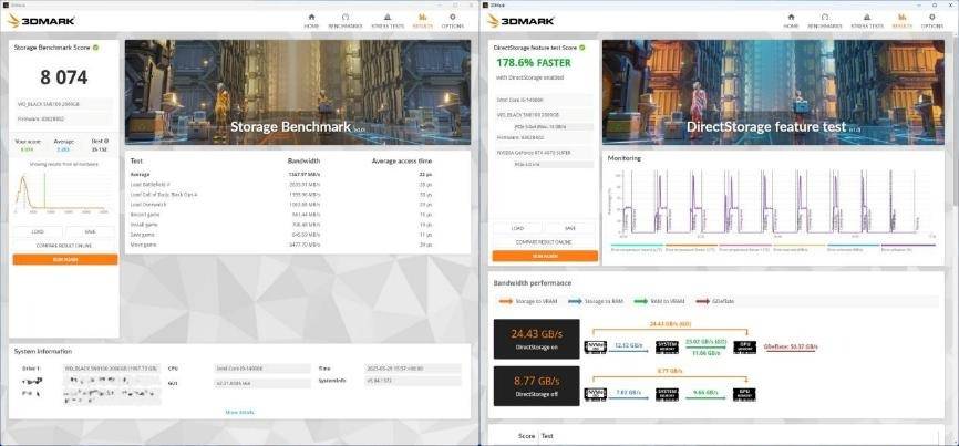 随着微软DirectStorage技术的普及,现代游戏开始允许GPU直接从NVMe SSD中读取数据。这意味着,SSD的读写速度直接决定了显卡能否及时获取渲染所需的素材。如果SSD速度跟不上,哪怕你拥有顶级的RTX 50系显卡,也可能因为等待数据传输而出现画面撕裂、贴图模糊甚至瞬间卡顿。