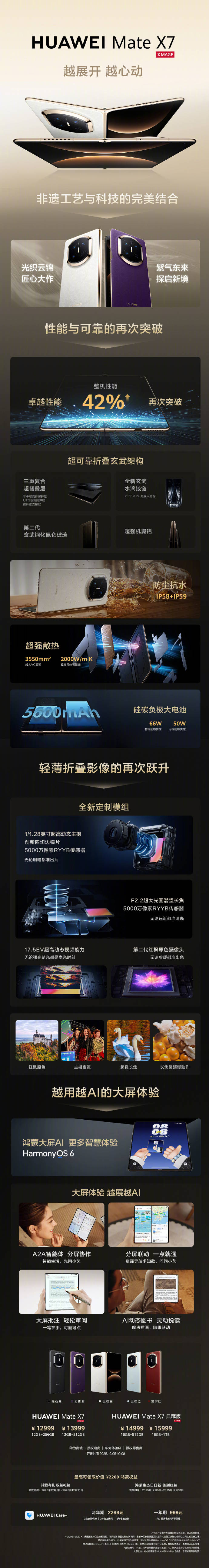 影像系统是本次升级的重点,Mate X7 搭载第二代红枫影像系统,通过相机模组小型化技术,首次在折叠屏上实现了直板旗舰级的影像能力。其后置四摄包括 5000 万像素可变光圈主摄、5000 万像素 3.5 倍光学长焦潜望镜头、4000 万像素超广角及第二代红枫原色摄像头,被余承东称为“折叠屏影像之王”。