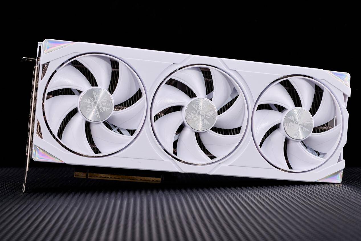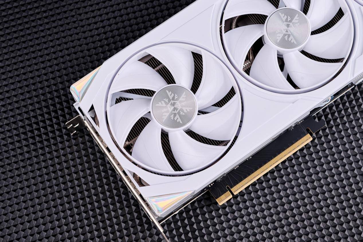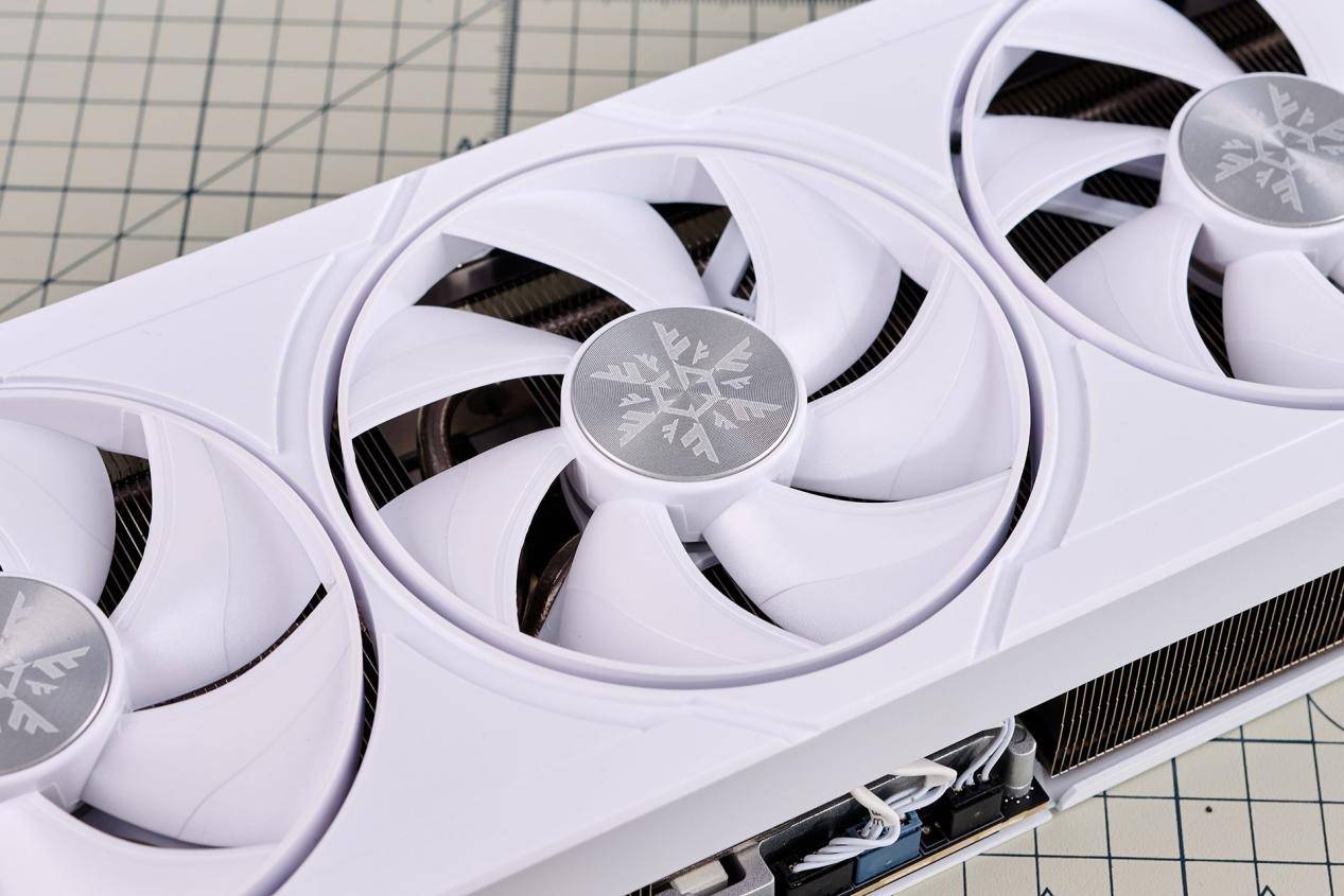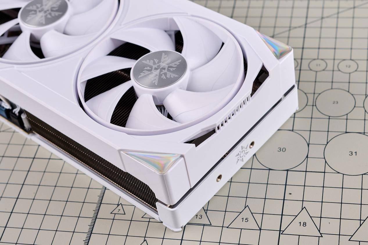 而外观中最为突出的自然是第三代“炫风之刃”,三颗92mm的特制白色风扇格外引人注目。这并非普通的扇叶,而是耕升独家的“炫风之刃”造型。每片扇叶边缘都带有特殊的3D导流沟槽,这种设计源自航空翼尖技术,能在高转速下有效切碎气流,降低风噪,同时提升进风量的集中度。