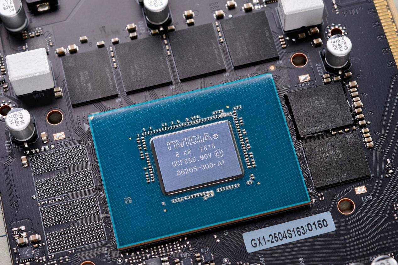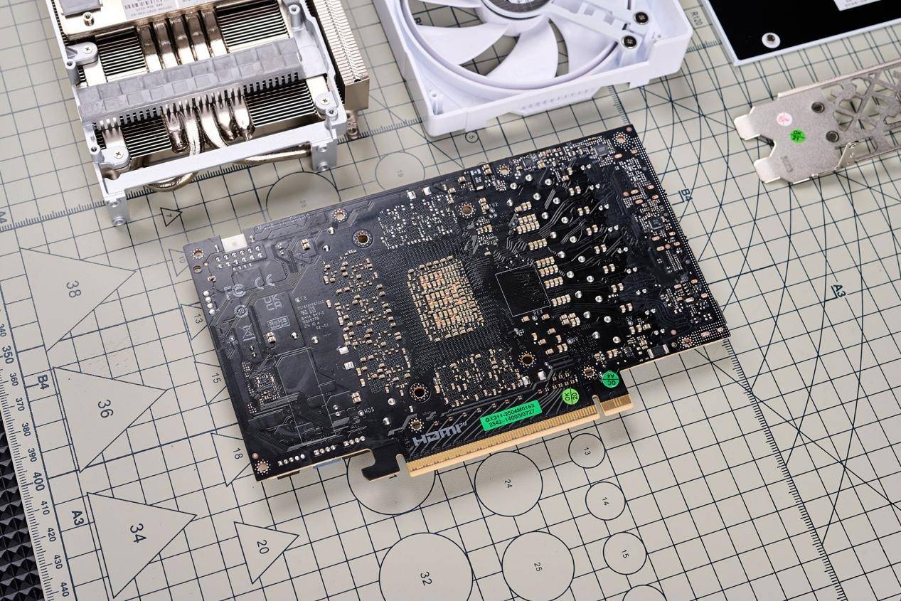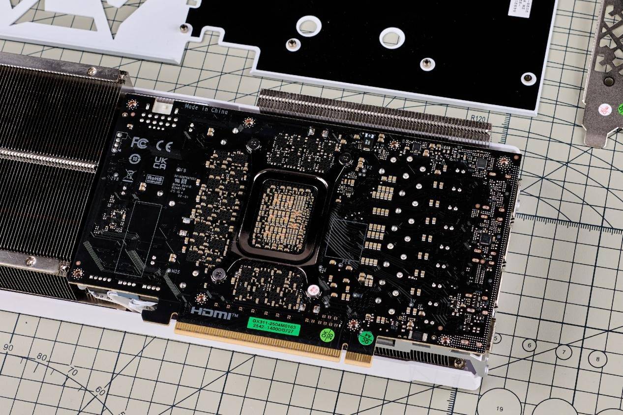 GB205核心被竖置于PCB中央,周围环绕着6颗GDDR7显存颗粒。这样的设计可以最大限度地缩短信号传输路径,提升数据交换效率,有效降低延迟。