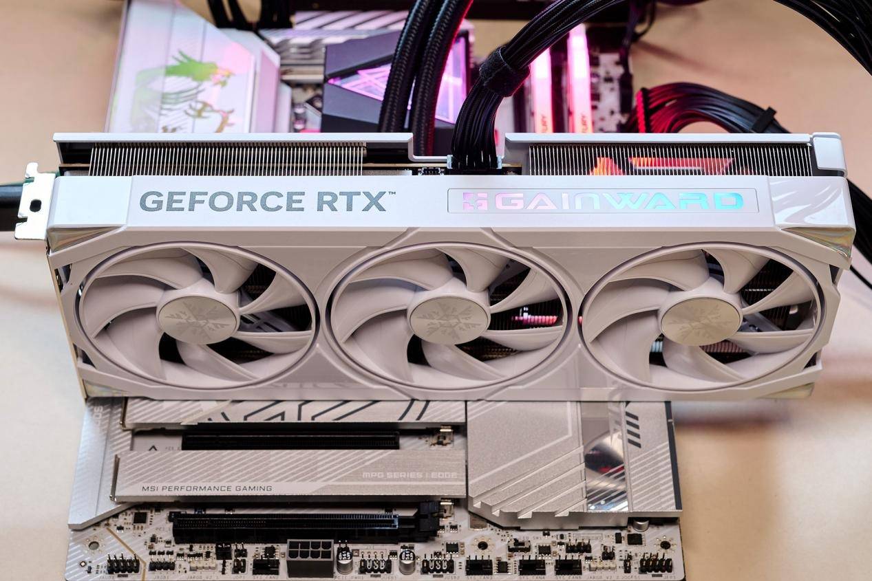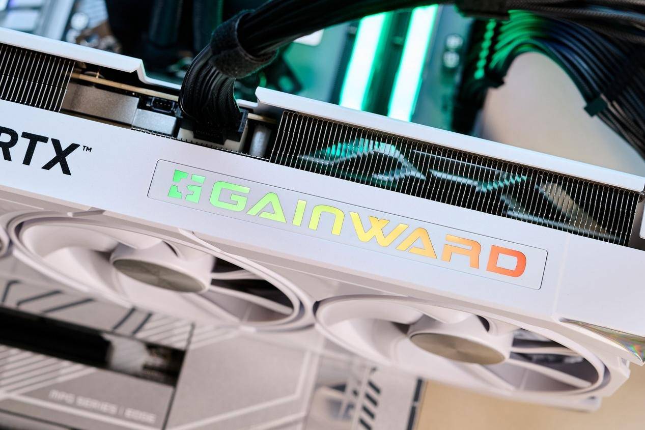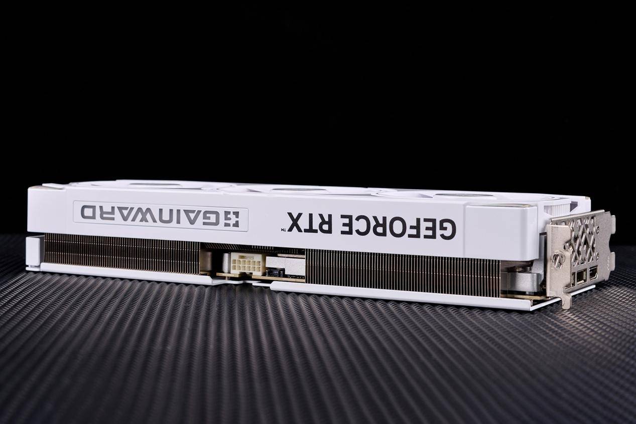侧面的 "GAINWARD" 与 "GEFORCE RTX" 标识排列工整。其中GAINWARD LOGO 采用ARBG隐藏式设计,通电后灯光透过LOGO缓缓透出,呈现出柔和而均匀的发光效果。