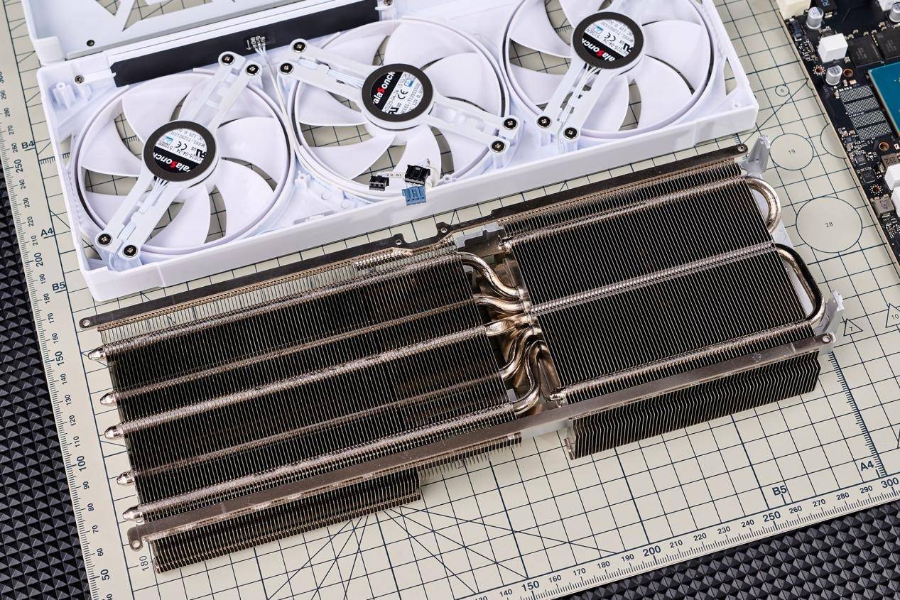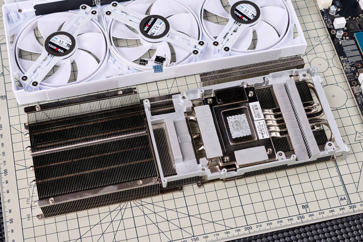 把PCB与散热器分离之后,耕升RTX 5070 踏雪 OC那个厚重的散热器模组展现 在眼前,5根镀镍热管贯穿整个散热鳍片组,紧密贴合GPU核心的镜面铜底与显存导热垫协同作业,确保热量迅速传导至鳍片。