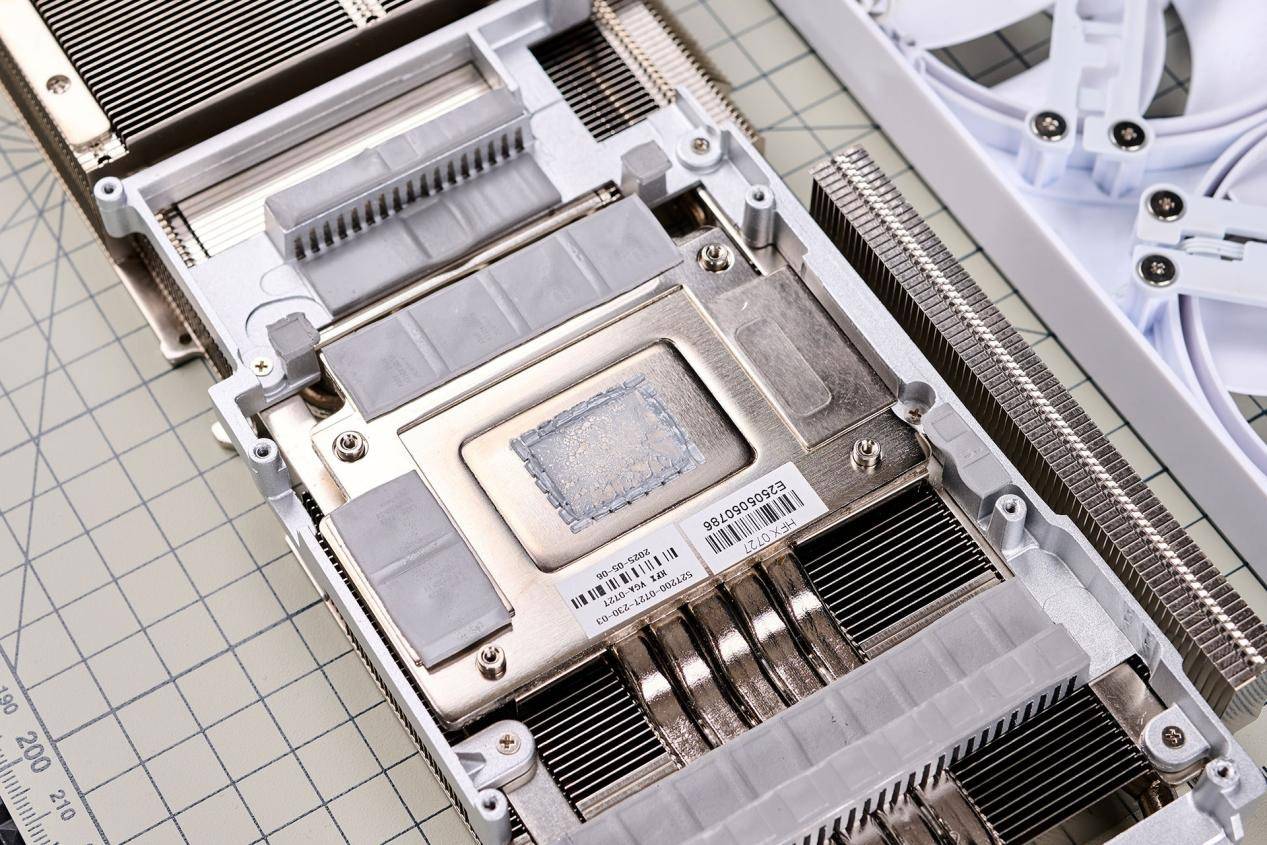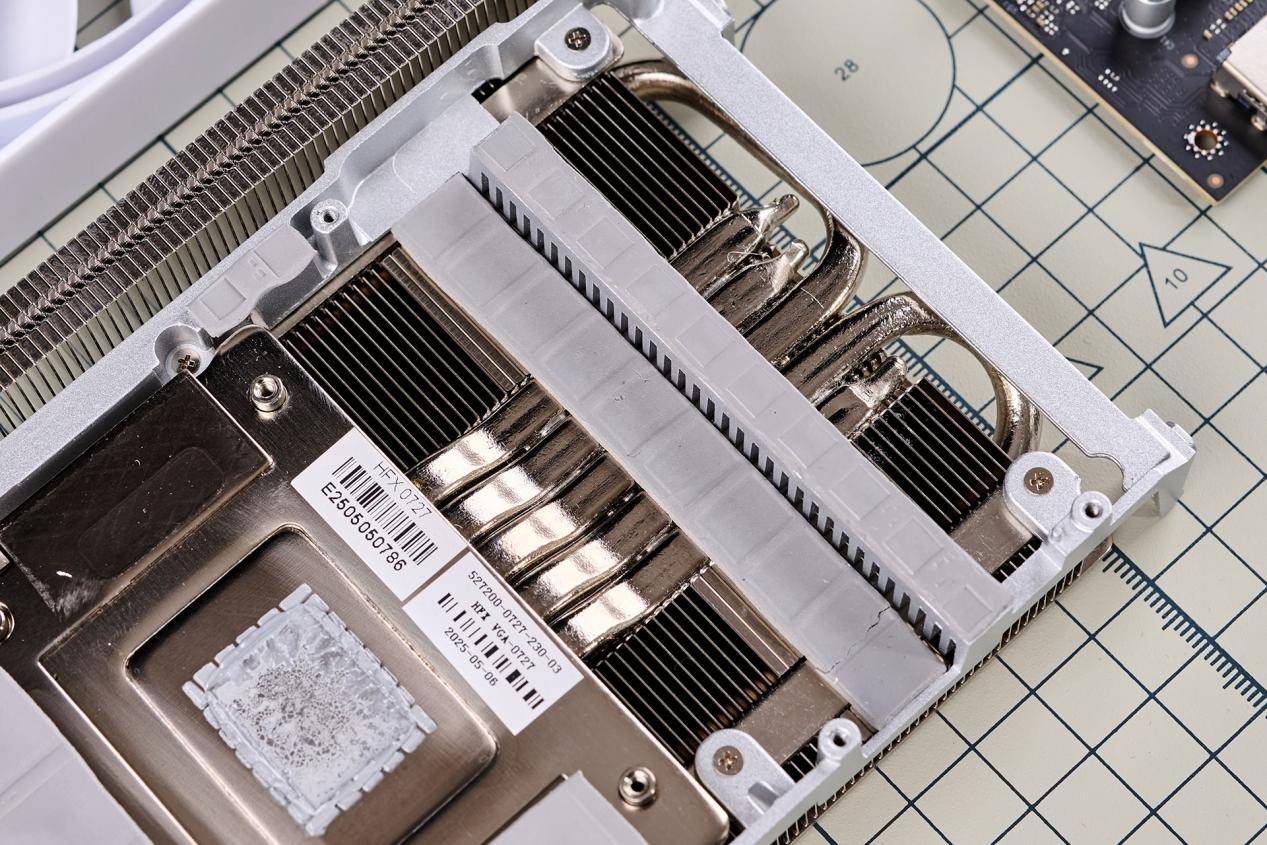 与 GPU 核心接触的是一块超大面积的纯铜底座,表面经过镀镍处理。这块底座不仅完全覆盖了GB205核心,还通过凸起设计覆盖了周围的GDDR7显存颗粒,保证了显存这种“发热大户”也能得到及时散热。