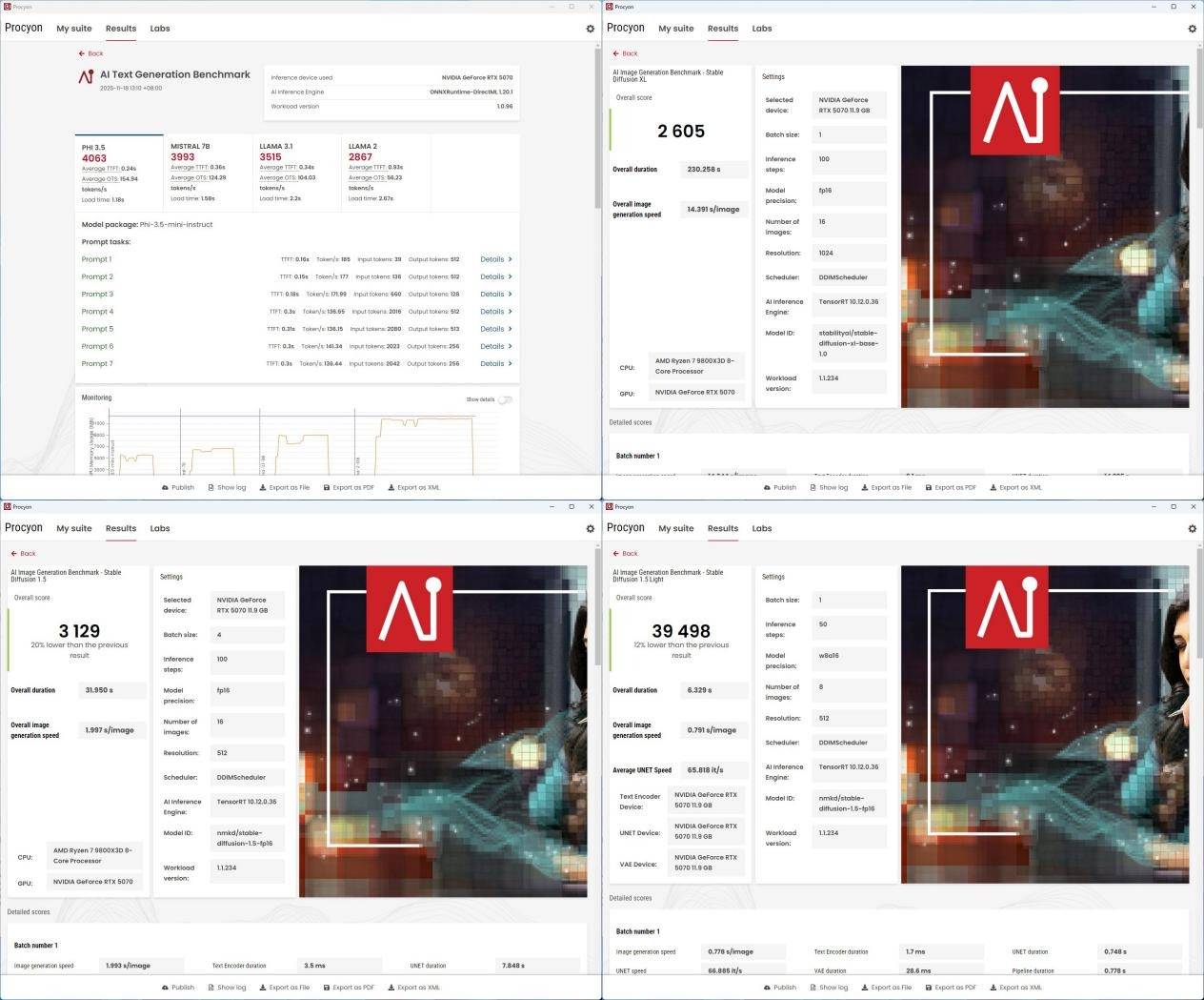 接下来就是AI性能测试,这里我们借用UL Procyon 软件进行模拟化的AIGC性能测试。测试结果显示,耕升RTX 5070 踏雪 OC在AI图像生成与视频生成任务中表现出色,得益于全新架构的Tensor Core,其AI推理速度较上代提升近75%。
