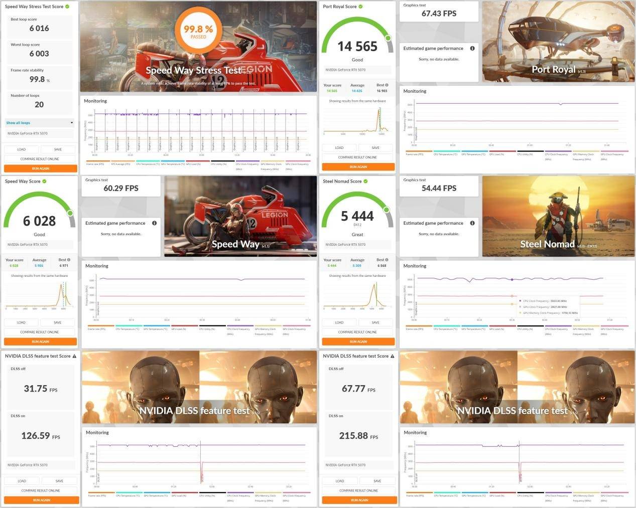 接下来是3DMark系列理论性能测试:这次我们先进行的是SPEED WAY STRESS烤机测试,20轮烤机测试仍是相当稳定,帧率稳定性达到了99.8%。同时可以看到在Port Royal与Steel Noman测试中的性能表现也是相当出色,显卡在光线追踪与光栅化渲染中均展现出强大算力。