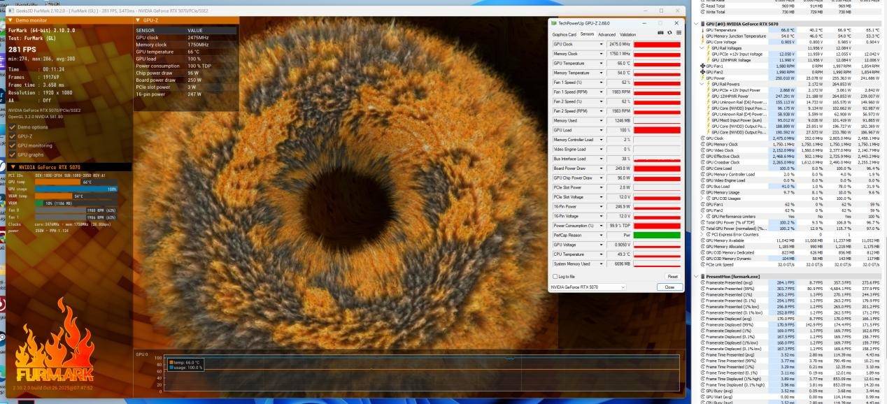 最后一项自然是烤机测试,耕升RTX 5070 踏雪 OC在长时间高负载运行下表现稳定,核心温度始终控制在66℃以内,显存温度更是低至54度。虽然说最近华南的天气有些降温,但是整体温度控制表现还真是相当不错。同时,在满载状态下,风扇转速维持在1983 rpm转速范围内,噪声水平不高,几乎与办公室环境相当。