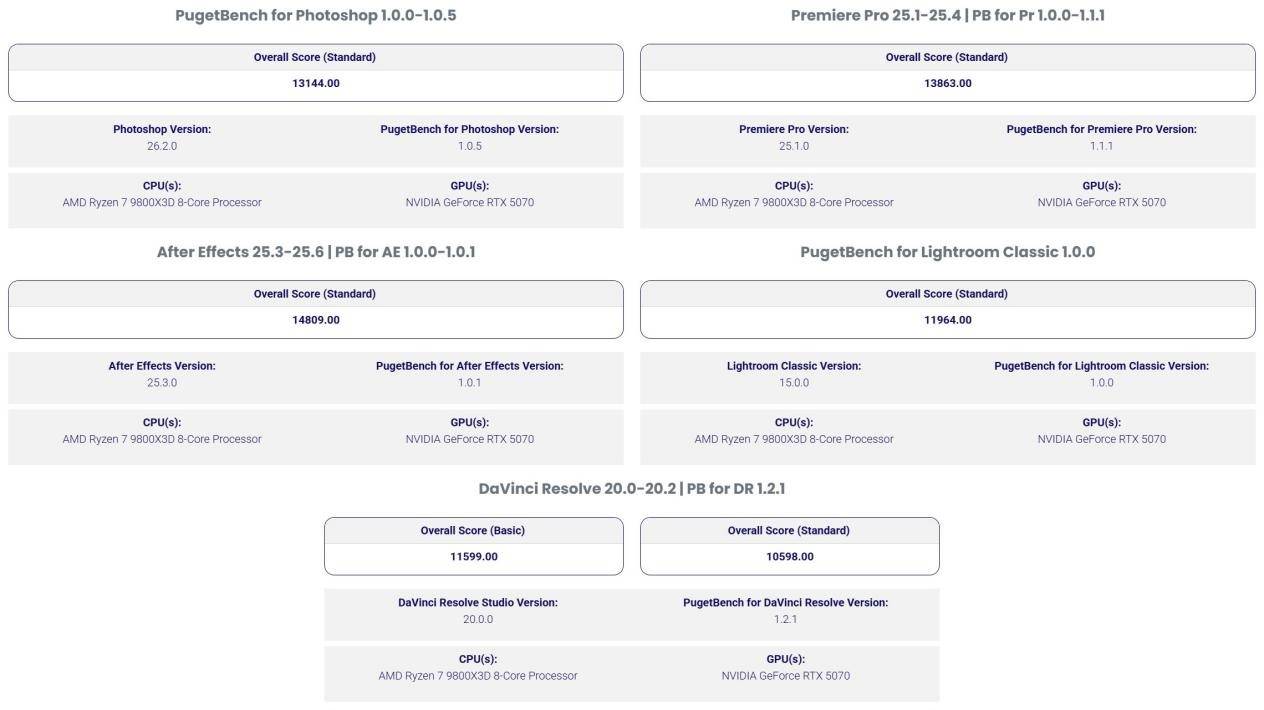 接下来是PugetBench 对Adobe全家桶的性能测试,重点考察视频剪辑与渲染导出表现。从成绩来看,耕升GeForce RTX 5070 踏雪 OC在视频基准测试中的表现令人瞩目,这主要归功于新一代GeForce RTX 5070编码器的进一步优化。因此,在达芬奇和Premiere Pro的测试得分都相当高。