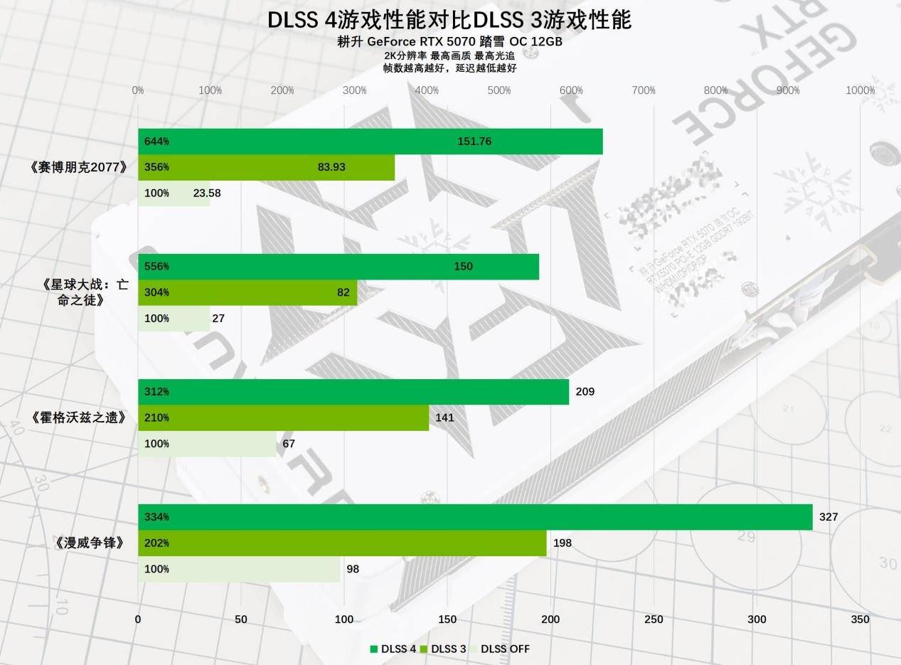 接下来,我们精心挑选了四款支持DLSS 4技术的游戏,以评估耕升GeForce RTX 5070 踏雪 OC在实际游戏中的性能表现。总体而言,DLSS 4的多帧生成功能无疑显著提升了玩家的游戏体验。与前一代RTX 40系列搭载的DLSS 3技术相比,DLSS 4进一步显著提高了帧数表现。在保持一致的画质设置下,耕升GeForce RTX 5070 踏雪 OC的性能提升极为突出。在我们测试的四款游戏中,启用DLSS 4后的流畅度几乎是RTX 4070的两倍!
