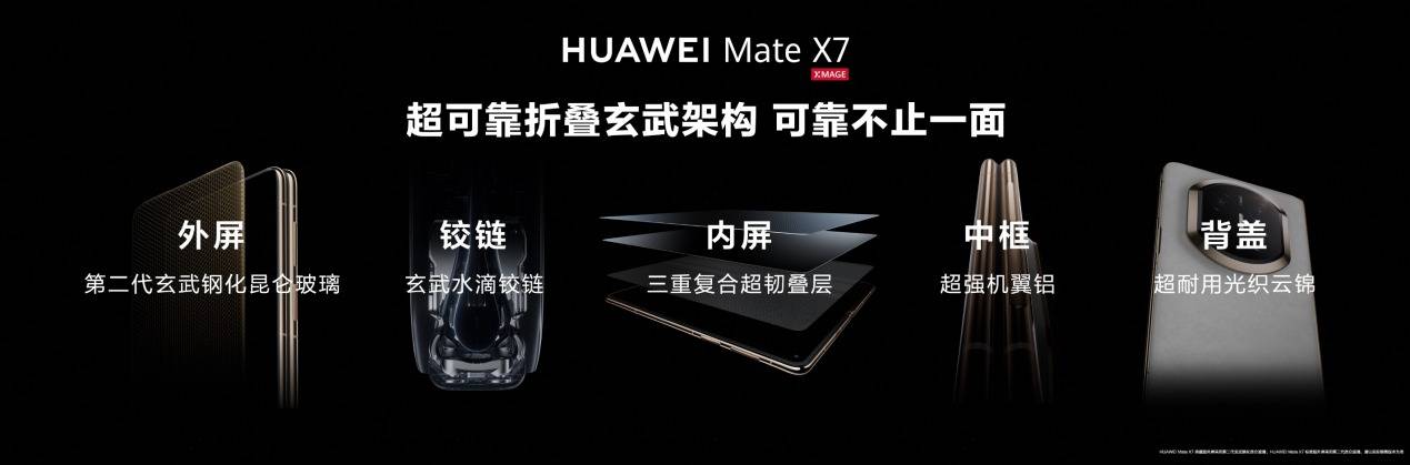 HUAWEI Mate X7机身架构实现革命性突破,搭载超可靠折叠玄武架构,可靠不止一面。第二代玄武钢化昆仑玻璃外屏、玄武水滴铰链、三重复合超韧叠层内屏、超强机翼铝中框、超耐用光织云锦背盖,五大升级协同,构筑超强防护,为用户提供可靠安心体验。折叠屏轻薄与可靠实现二者兼得。