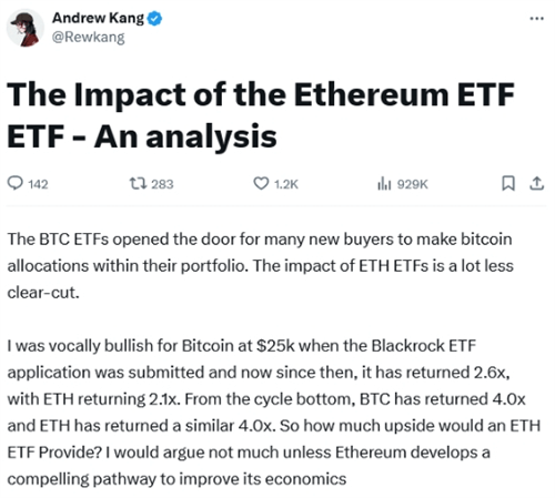 根据 CoinGecko 的数据,撰写本文时,以太币的价格在3410美元左右徘徊。Kang 在社交媒体上发表了自己的看法,他认为,与比特币相比,以太币对机构投资者的吸引力没那么大,而且将以太币转化为 ETF 的动力也不足。另外,以太坊网络的现金流状况也不容乐观。