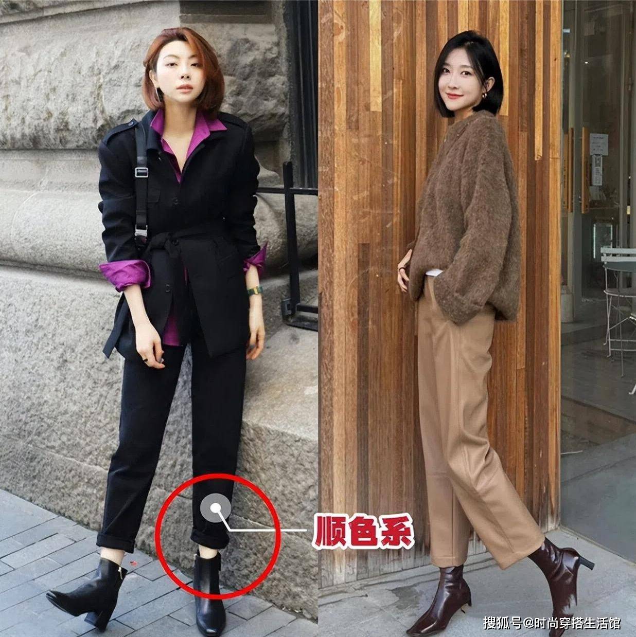 对于冬天来说最好的方式就是可以选择顺色系或者同色系,比如我们选择黑色齐踝裤和黑色靴子,大地色齐踝裤和棕色短靴,这样的色彩穿搭不仅避免了裤子和靴子出现割裂感,同时还能延长穿搭造型。
