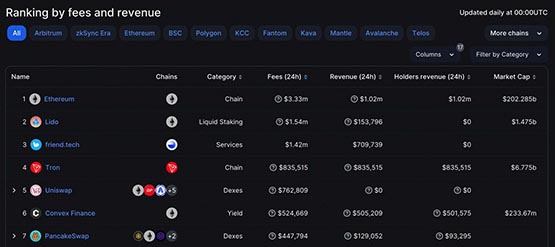 DefiLlama 的数据显示,过去 24 小时,Friend.tech 产生的协议费用达到了 142 万美刀,超过了 Tron 和 Uniswap,位列第三,仅次于以太坊和 Lido 协议。同时,Friend.tech 过去 24 小时的协议收入也达到了 709,739 美刀,同样位列第三,仅次于以太坊和 Tron。