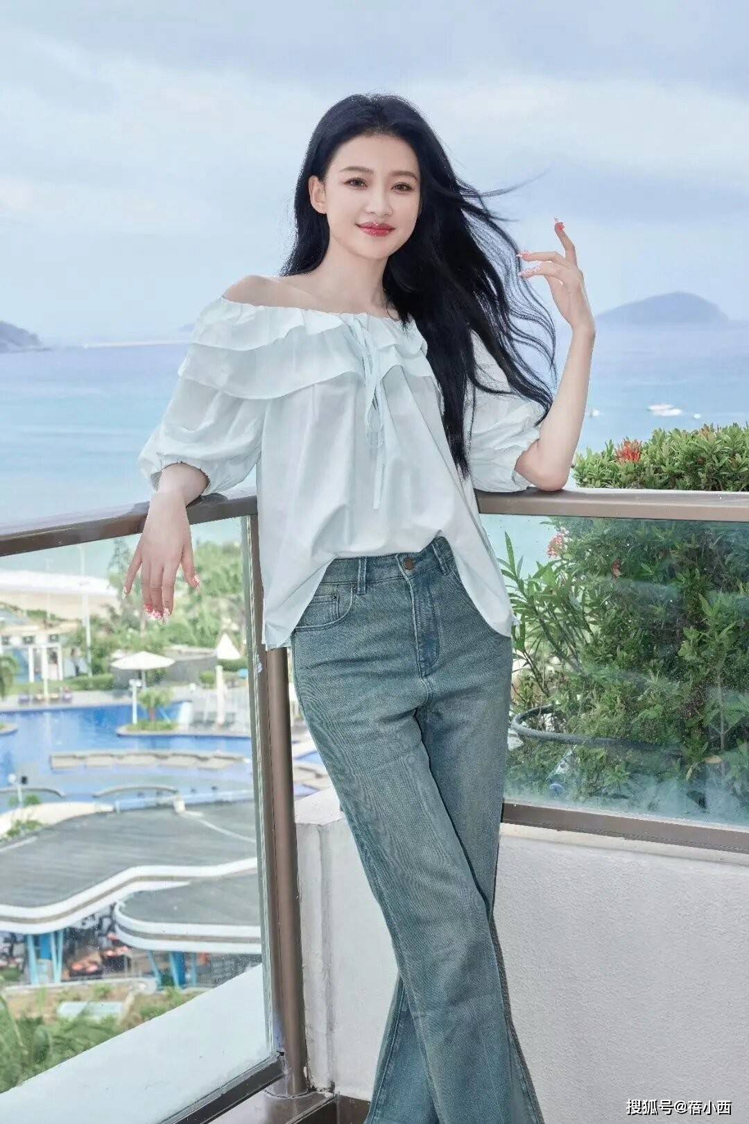 5,一字肩荷叶边衬衫搭配牛仔裤