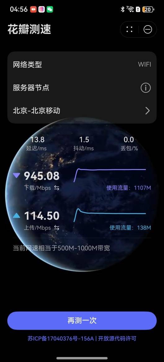 为了验证华为路由 X3 Pro 日照金山的不同配置效果,本次测试来到一个建筑面积为156平方米的大户型中,并接入1000Mbps的宽带。在仅使用母路由,并将母路由放在客厅靠墙的电视柜上时,在无遮挡的情况下靠近使用手机测速,下载速度可以稳定在945Mbps左右。