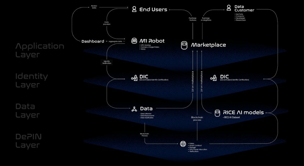 RICE AI 构建了一个多层次的生态系统,用于数据收集、身份验证、AI 模型创建和市场互动。 它的主要层次包括: