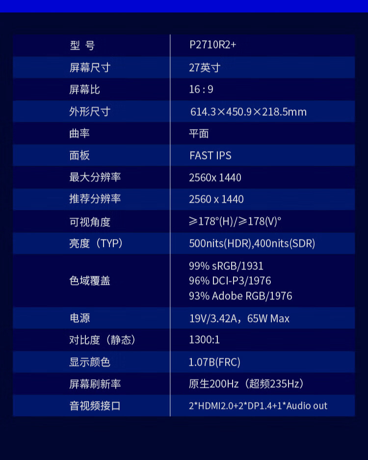 据悉,这款显示器是 P2710R2 的升级版,相比旧款型号在刷新率、最高亮度、色域等方面均有提升,搭载 Fast IPS 快速液晶面板,其响应速度相较于普通 IPS 有所提升。