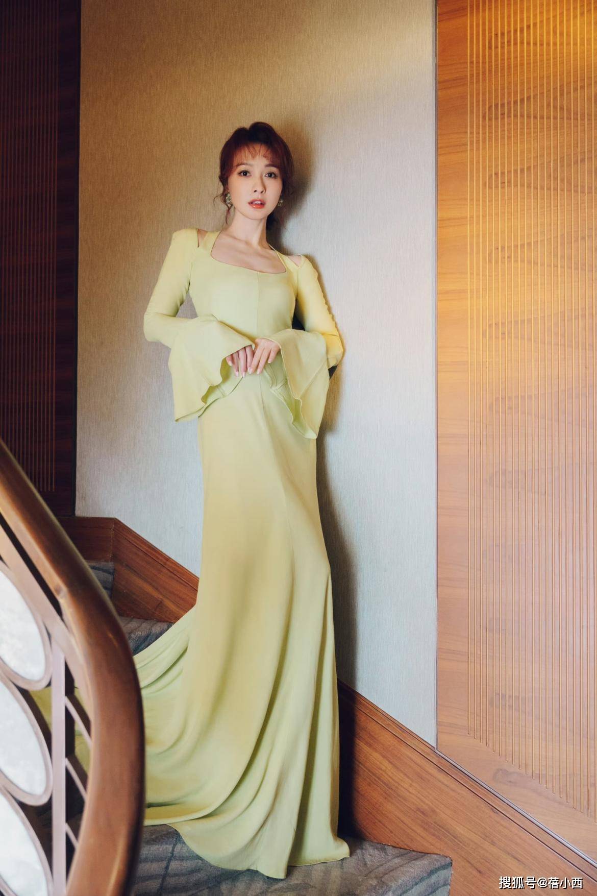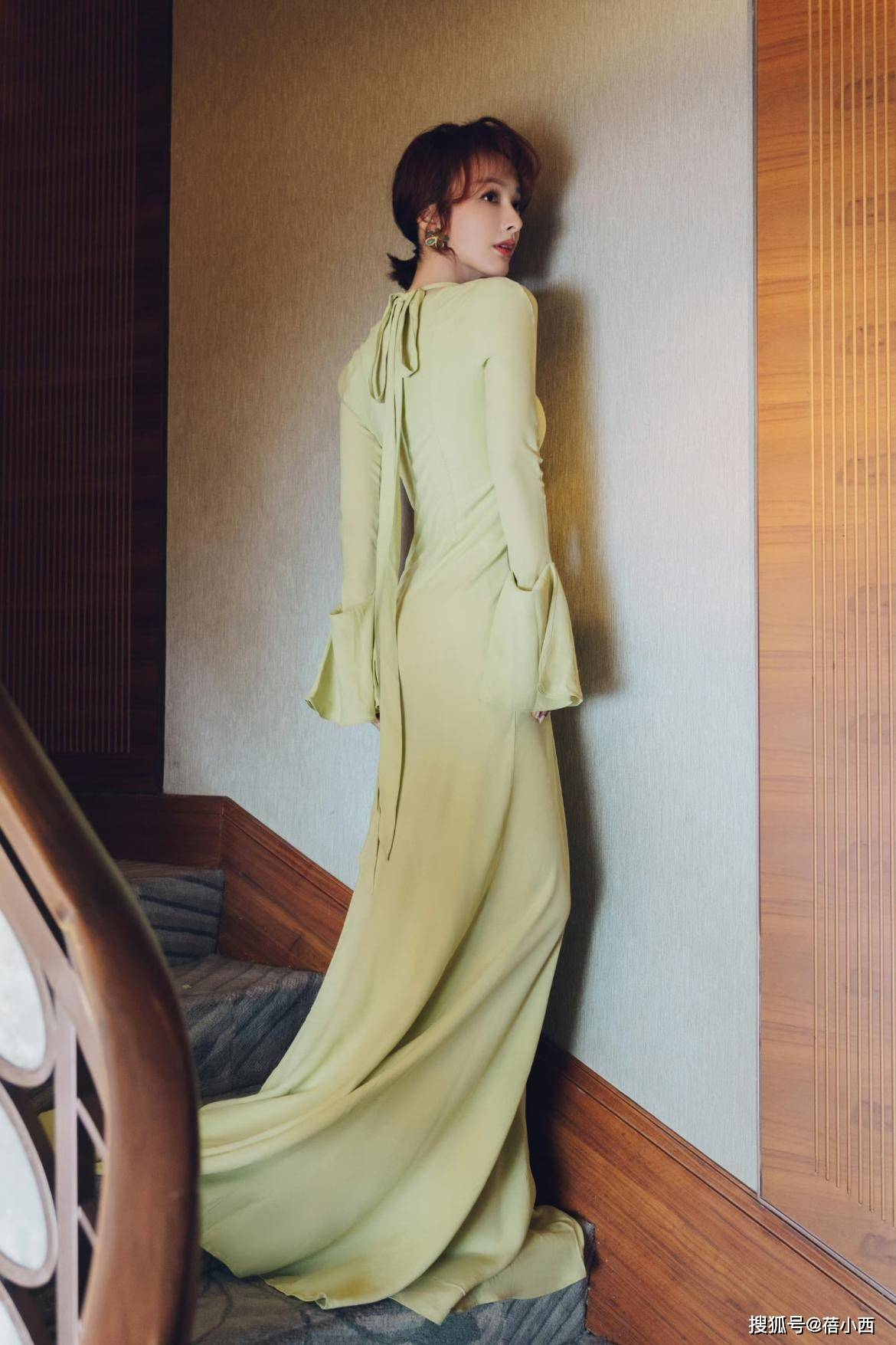 这一身绿色连衣裙长度拖地,穿在身上特别有气场,但是的确也更挑身材,比较适合高个子,还好吴昕的身材苗条,穿上拖地连衣裙则不为何,再结合扎发的造型体现利落感,还是挺时髦的。