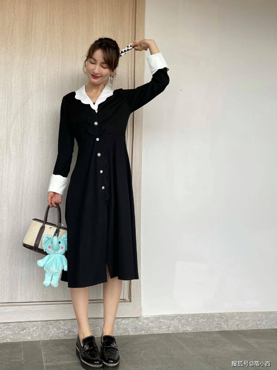 黑色连衣裙属于经典款,而且选这种基础色连衣裙的时候,细节设计特别重要,这会影响你的搭配风格,也会改变你的气质,吴昕这一身黑色连衣裙结合白色领口,拼色处理更加时髦,再加上黑色小皮鞋搭配在脚下,和连衣裙呼应,更显和谐。