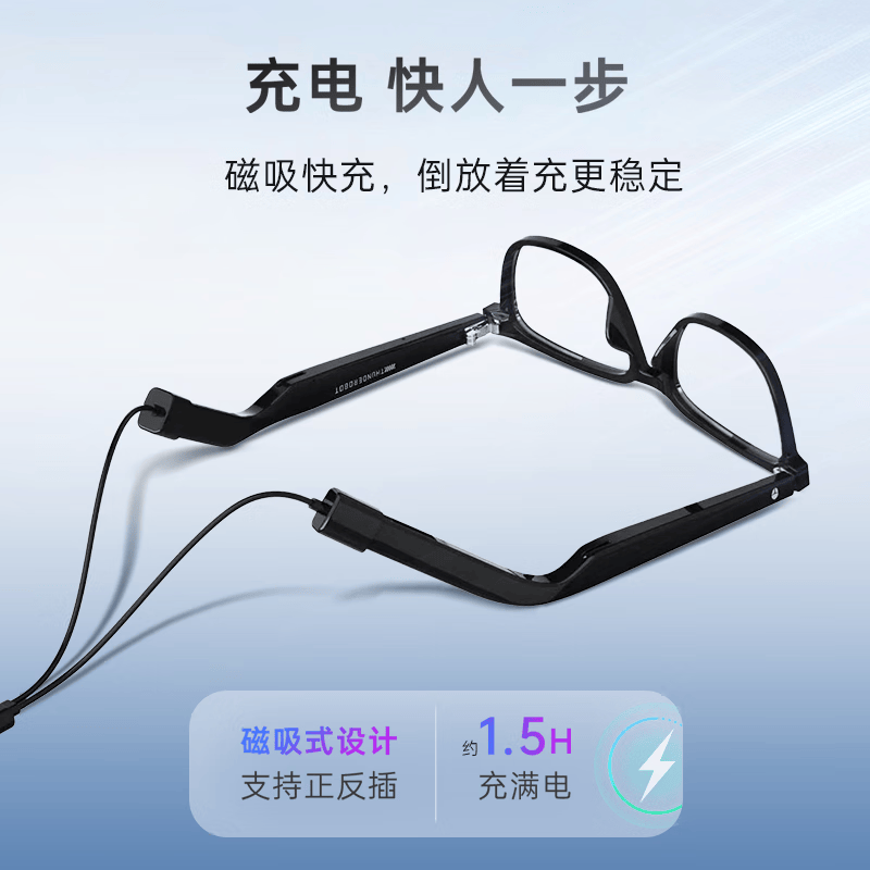 产品内置专属芯片并采用蓝牙 5.3 连接,配备 140mAh 电池,在音乐播放场景下续航为 12 小时,支持磁吸充电。其电子结构全部集成于镜腿,不影响镜片更换,用户可根据需要自由配装光学镜片。