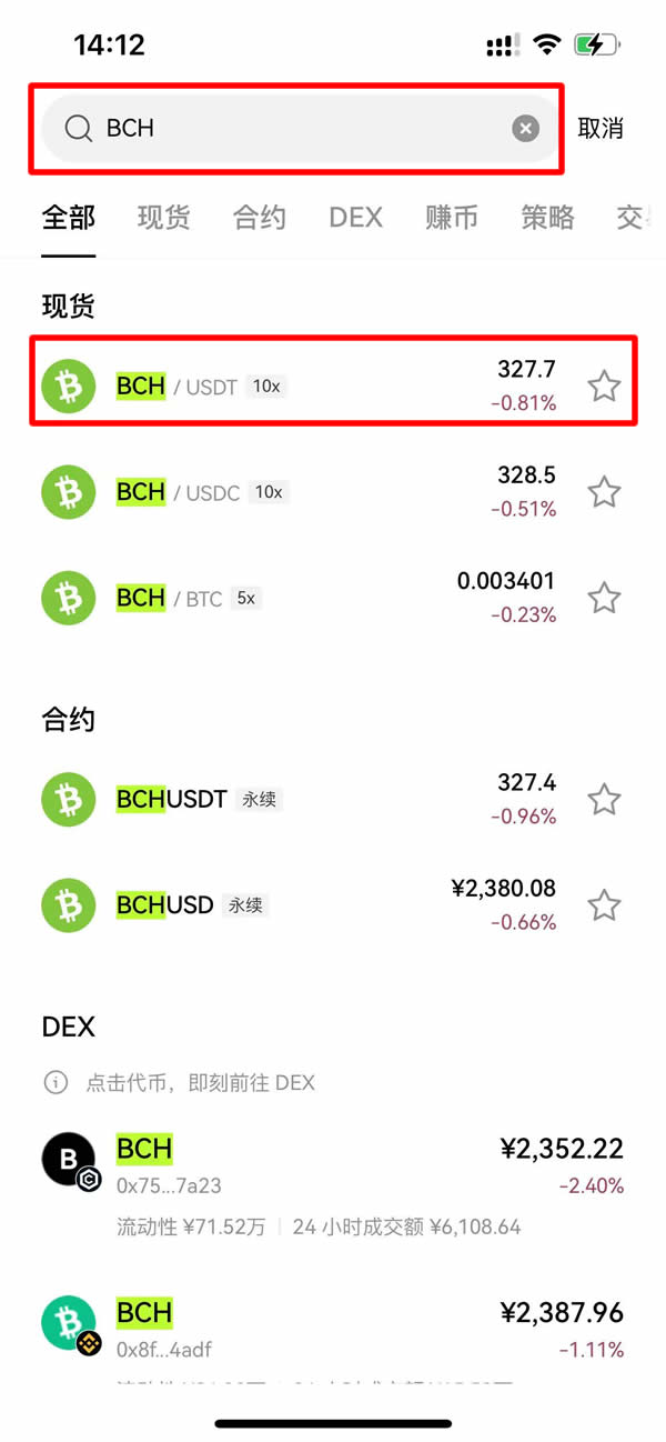 3、在搜索框中输入“BCH”,找到BCH/USDT交易对。