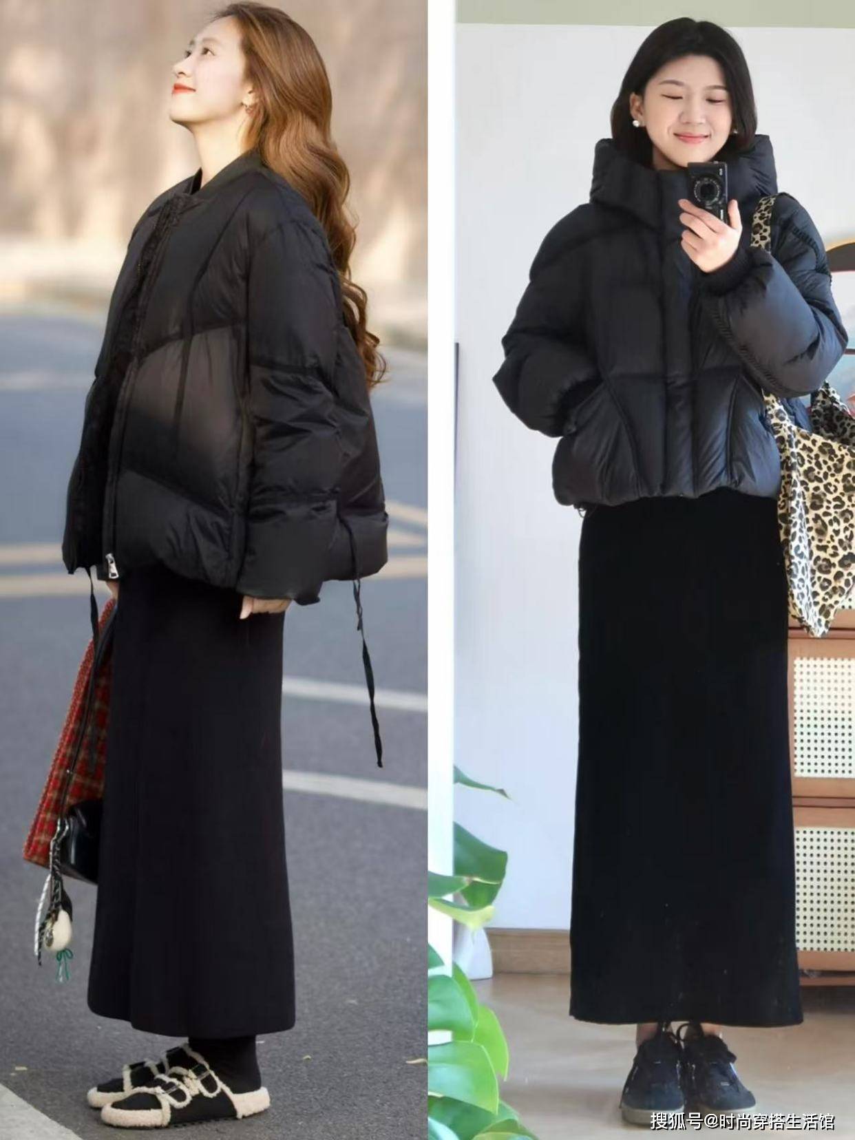 最后就是穿短羽绒服搭配裙子确实非常好看,但是我们还要注意裙子版型的选择,毕竟羽绒服和裙子都是属于宽松的版型,并不是说裙子宽松一点更遮肉显瘦,选择太过于宽松的裙子反而会横向拉宽身材导致膨胀感,尤其是我们选择短羽绒服搭配会将我们的下半身延展开来,更臃肿和显胖。