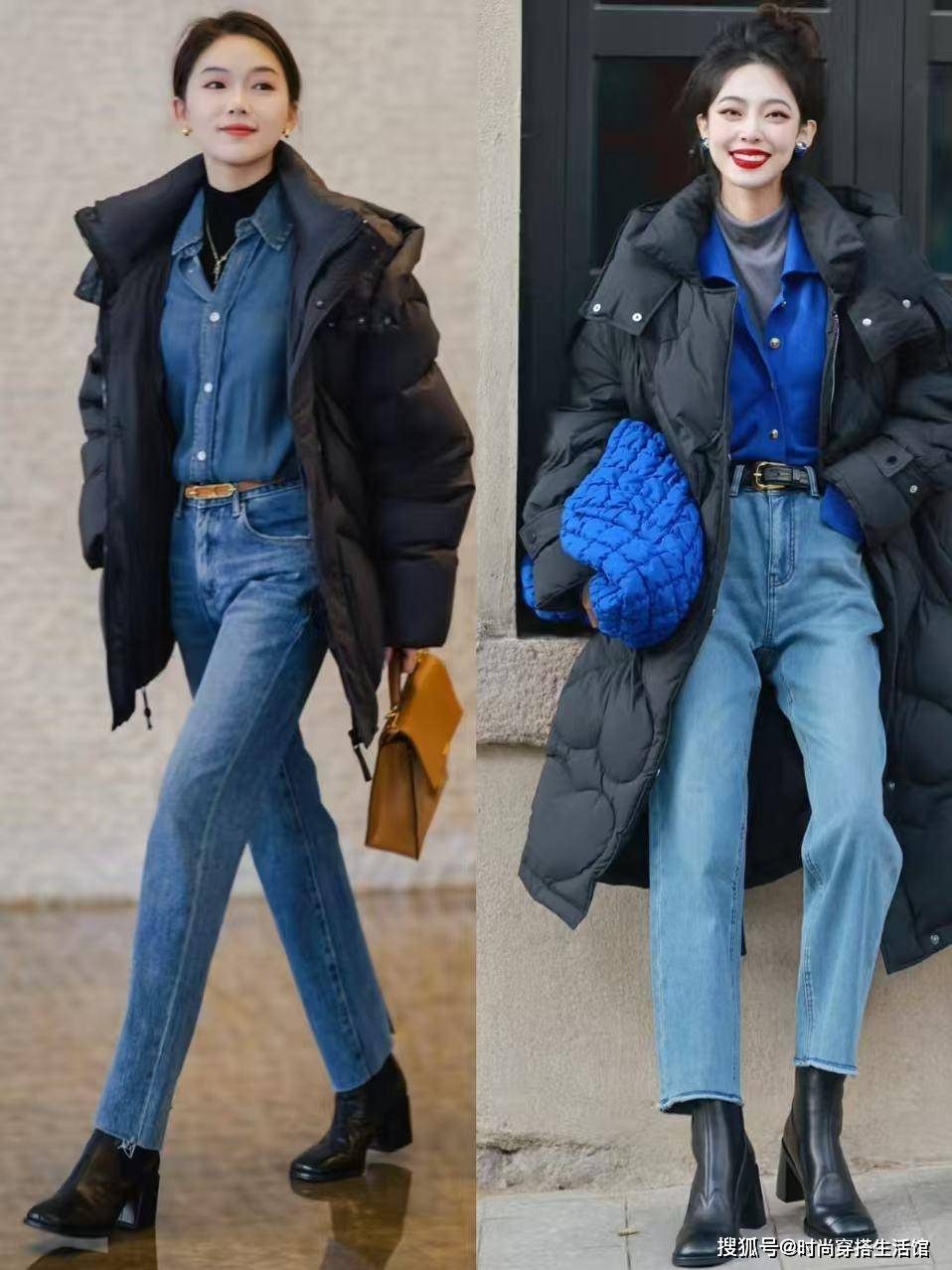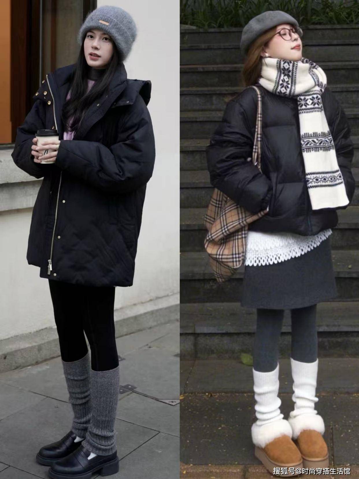 冬天穿羽绒服最常见的留白方式有搭配九分裤、半身裙、短裙和长筒靴,我们能够适当的露出大腿、脚踝、锁骨和腰部在保暖的同时还能凸显出轻盈感,完美避免了羽绒服带来的笨重。