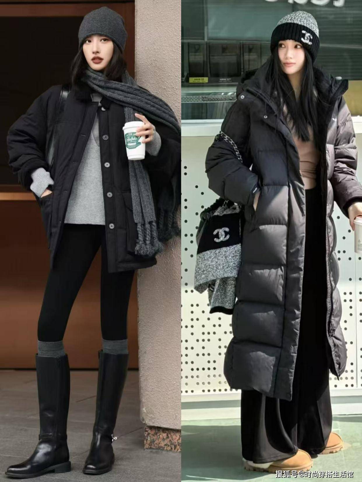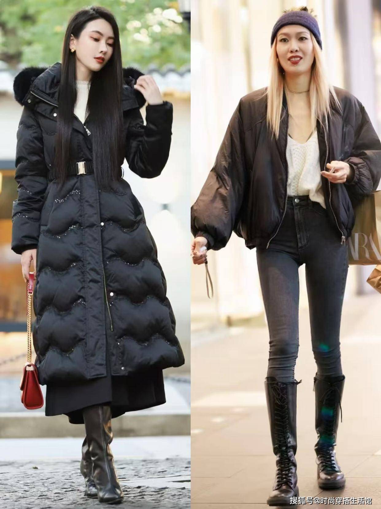 <组合二>黑色羽绒服配长筒靴,显腿长