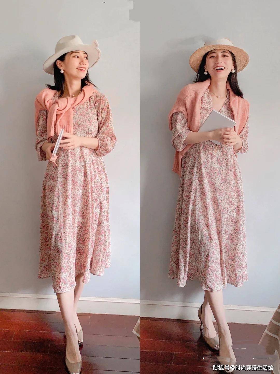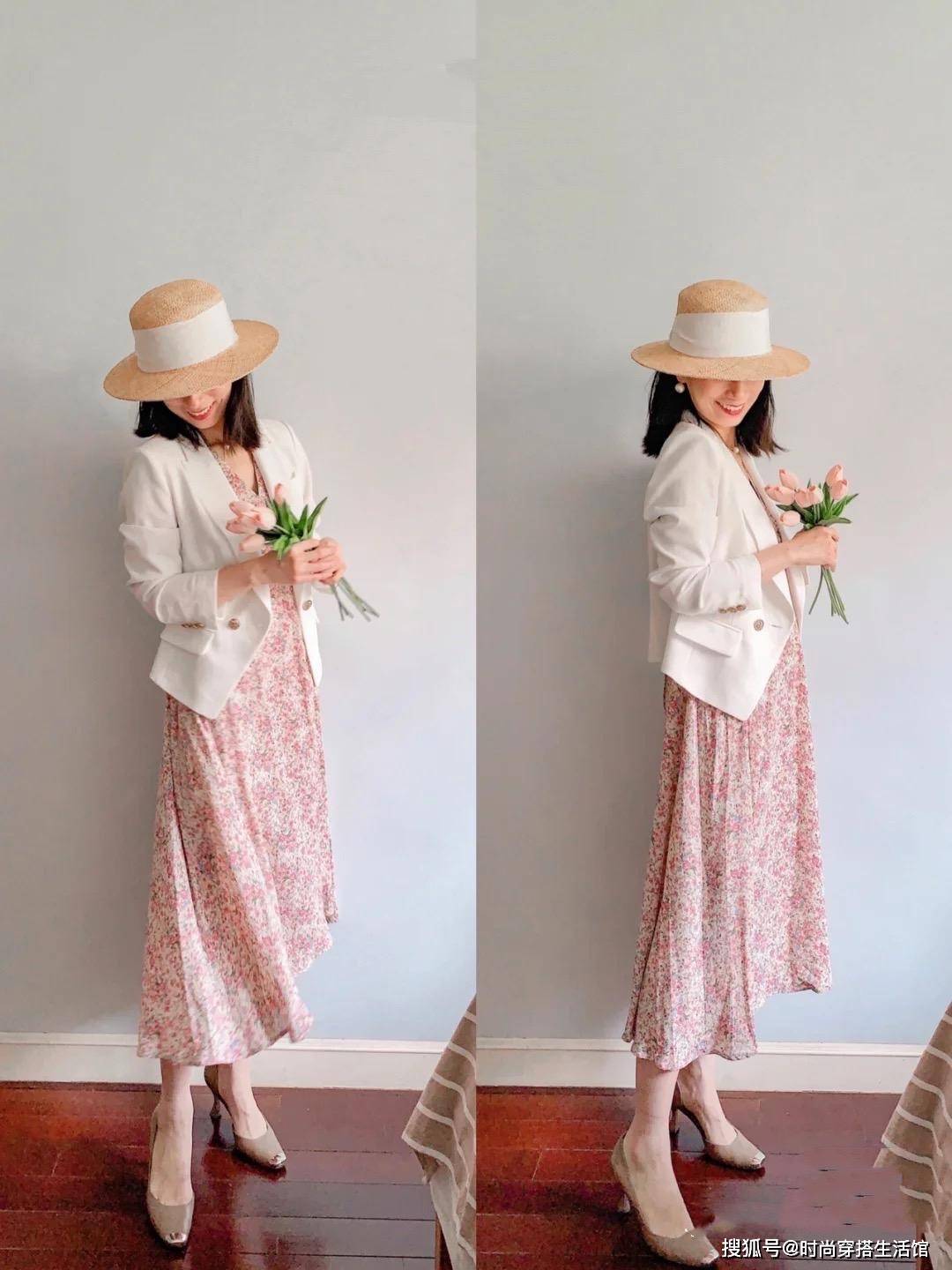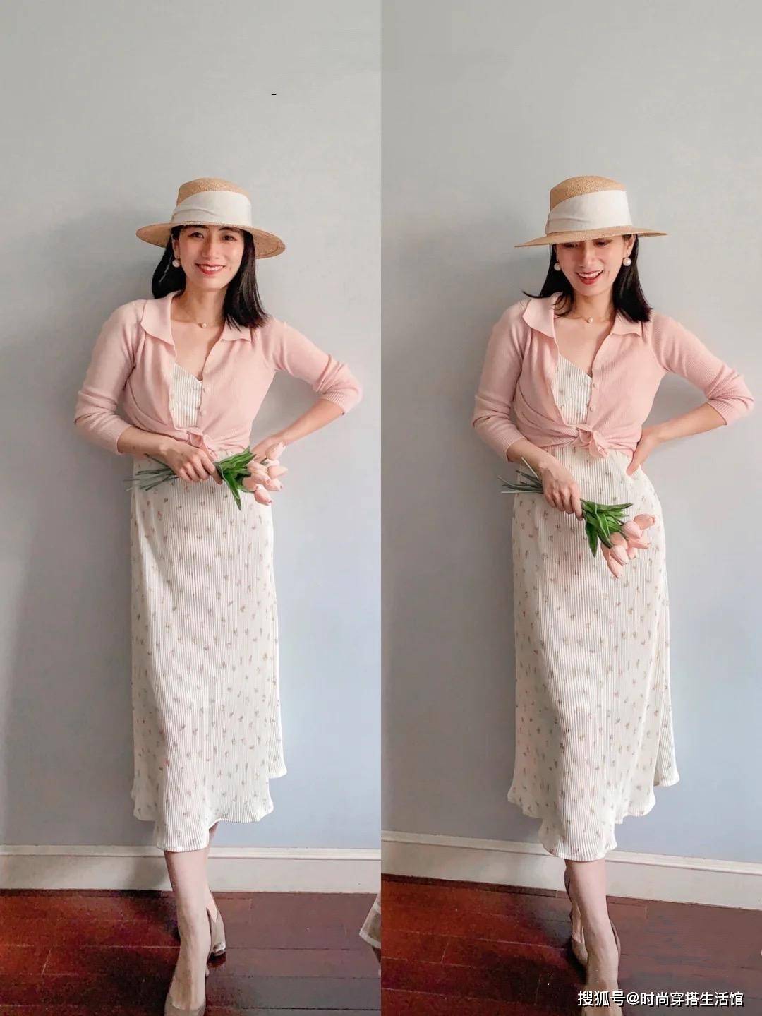 40岁后的女人不仅可以穿粉色,还可以穿粉色连衣裙。不过最好搭配一件基础色的外套,利用外套来将大面积的粉色进行“切割”。比如,粉红色的连衣裙搭配一件白色的长款薄外套,在视觉上隐藏了大部分的粉色。
