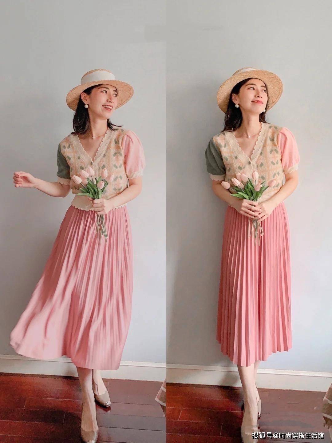 粉色和软糯的针织衫真的是一拍即合,毫不费力就能穿出温柔如水的优雅感。首先搭配就是半身裙,梨型身材可以选择深色裙装,身材苗条的可以选择浅色下装,减龄的效果更明显。
