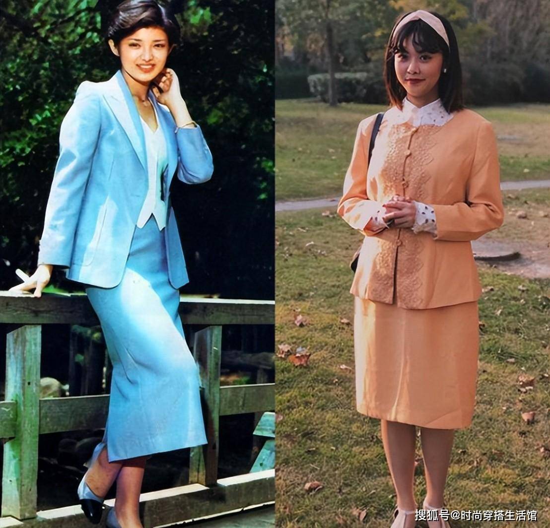 山口百惠当时就一身知性的西装上衣搭配西装长裙,里面随意搭配的V领小衫,走在街上尤为出众。素雅淡薄的浅蓝色配上中式一点的发型,莫名有种女强人的风范儿,甚至还会增添一丝帅气在其中。
